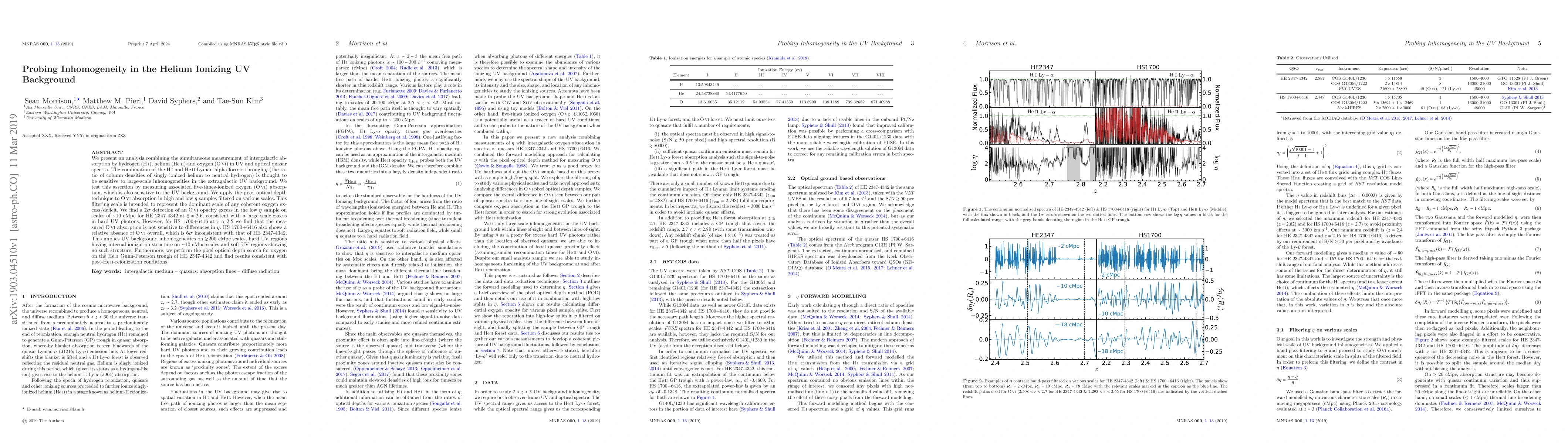 We present an analysis combining the simultaneous measurement of intergalactic absorption by hydrogen (H I), helium (He II) and oxygen (O VI) in UV and optical quasar spectra. The combination of the H I and He II Lyman-alpha forests through $\eta$ (the ratio of column densities of singly ionized helium to neutral hydrogen) is thought to be sensitive to large-scale inhomogeneities in the extragalactic UV background. We test this assertion by measuring associated five-times-ionized oxygen (O VI) absorption, which is also sensitive to the UV background. We apply the pixel optical depth technique to O VI absorption in high and low $\eta$ samples filtered on various scales. This filtering scale is intended to represent the dominant scale of any coherent oxygen excess/deficit. We find a $2\sigma$ detection of an O VI opacity excess in the low $\eta$ sample on scales of $\sim$10 cMpc for HE 2347-4342 at $\bar{z}\approx 2.6$, consistent with a large-scale excess in hard UV photons. However, for HS 1700+6416 at $\bar{z}\approx 2.5$ we find that the measured O VI absorption is not sensitive to differences in $\eta$. HS 1700+6416 also shows a relative absence of O VI overall, which is $6\sigma$ inconsistent with that of HE 2347-4342. This implies UV background inhomogeneities on $\gtrsim$200 cMpc scales, hard UV regions having internal ionization structure on $\sim$10 cMpc scales and soft UV regions showing no such structure. Furthermore, we perform the pixel optical depth search for oxygen on the He II Gunn-Peterson trough of HE 2347-4342 and find results consistent with post-He II-reionization conditions.