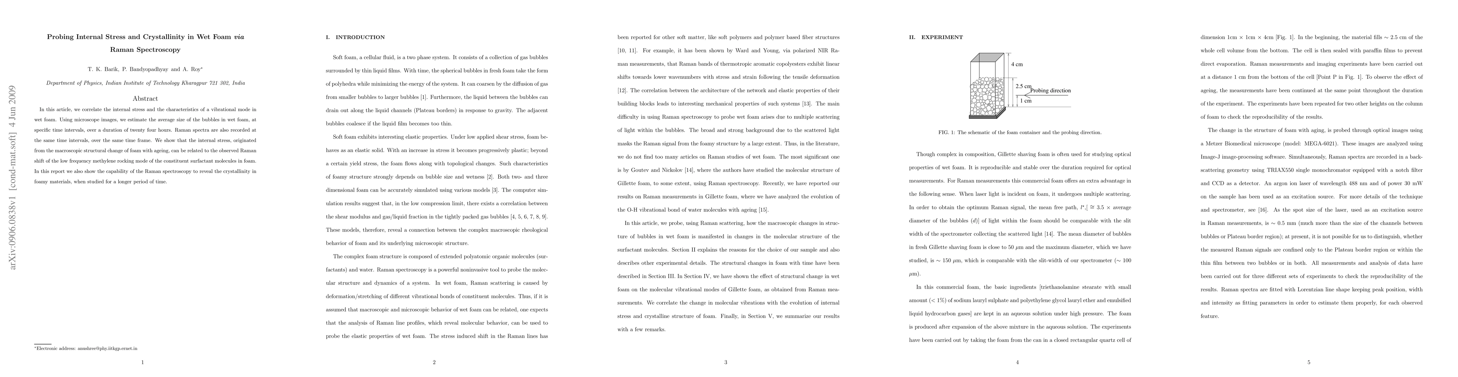This study correlates internal stress and crystallinity in wet foam with Raman spectroscopy, showing that macroscopic structural changes over 24 hours affect the Raman shift of surfactant molecules. It also demonstrates Raman spectroscopy's ability to reveal crystallinity in foam materials over extended periods.