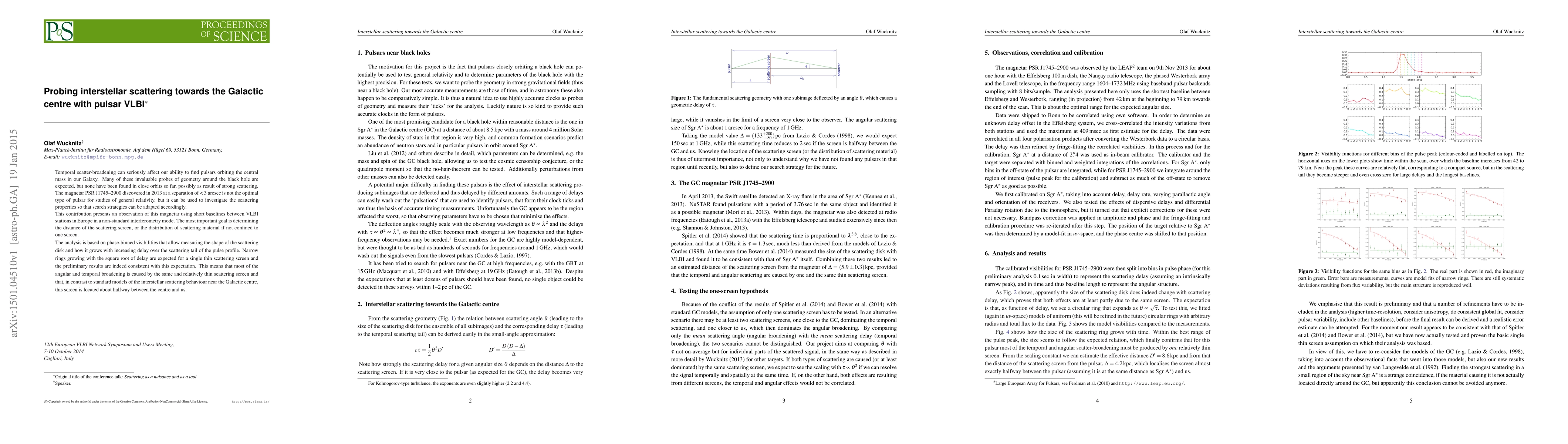 Temporal scatter-broadening can seriously affect our ability to find pulsars orbiting the central mass in our Galaxy. Many of these invaluable probes of geometry around the black hole are expected, but none have been found in close orbits so far, possibly as result of strong scattering. The magnetar PSR J1745-2900 discovered in 2013 at a separation of < 3 arcsec is not the optimal type of pulsar for studies of general relativity, but it can be used to investigate the scattering properties so that search strategies can be adapted accordingly. This contribution presents an observation of this magnetar using short baselines between VLBI stations in Europe in a non-standard interferometry mode. The most important goal is determining the distance of the scattering screen, or the distribution of scattering material if not confined to one screen. The analysis is based on phase-binned visibilities that allow measuring the shape of the scattering disk and how it grows with increasing delay over the scattering tail of the pulse profile. Narrow rings growing with the square root of delay are expected for a single thin scattering screen and the preliminary results are indeed consistent with this expectation. This means that most of the angular and temporal broadening is caused by the same and relatively thin scattering screen and that, in contrast to standard models of the interstellar scattering behaviour near the Galactic centre, this screen is located about halfway between the centre and us.