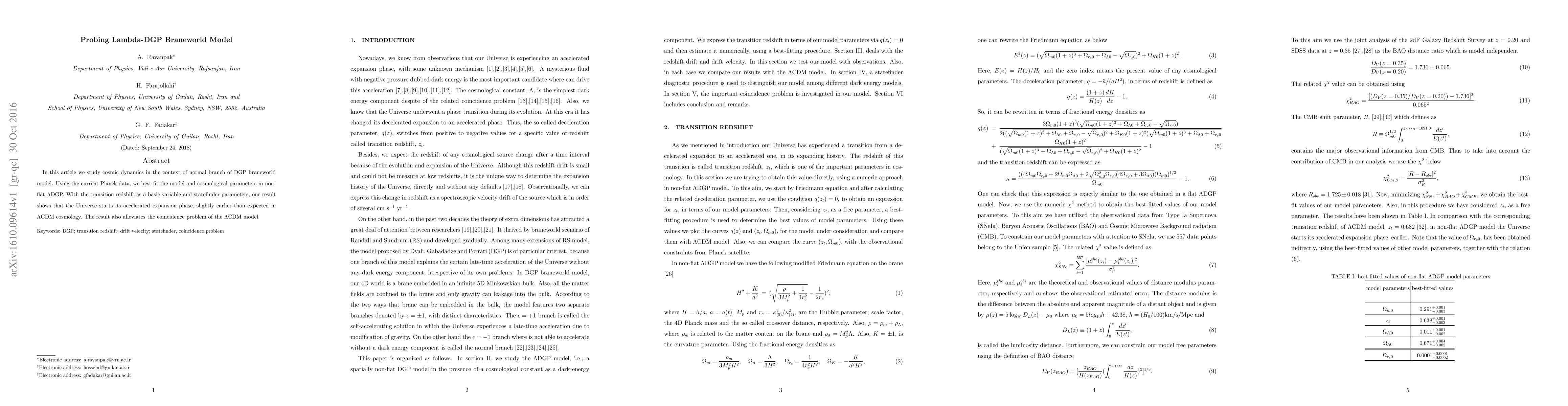 In this article we study cosmic dynamics in the context of normal branch of DGP braneworld model. Using the current Planck data, we best fit the model and cosmological parameters in non-flat $\Lambda$DGP. With the transition redshift as a basic variable and statefinder parameters, our result shows that the Universe starts its accelerated expansion phase, slightly earlier than expected in $\Lambda$CDM cosmology. The result also alleviates the coincidence problem of the $\Lambda$CDM model.