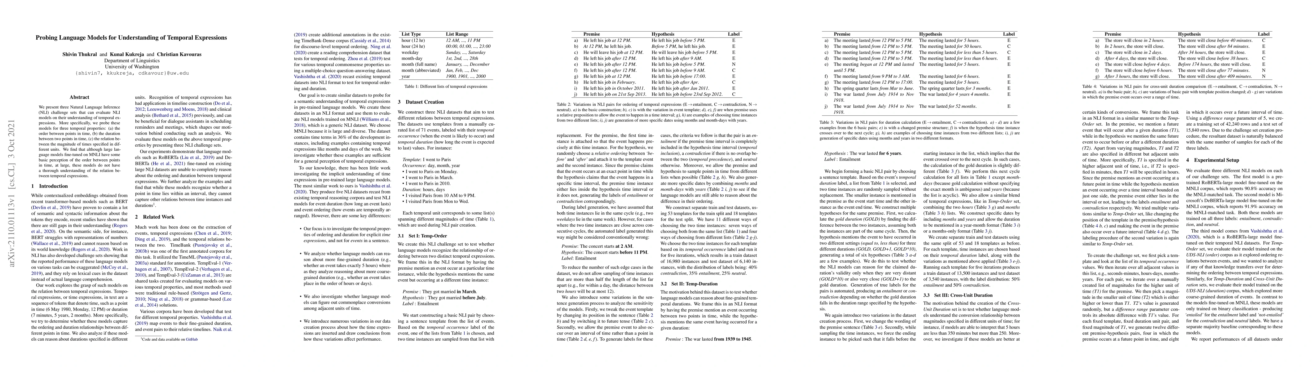We present three Natural Language Inference (NLI) challenge sets that can evaluate NLI models on their understanding of temporal expressions. More specifically, we probe these models for three temporal properties: (a) the order between points in time, (b) the duration between two points in time, (c) the relation between the magnitude of times specified in different units. We find that although large language models fine-tuned on MNLI have some basic perception of the order between points in time, at large, these models do not have a thorough understanding of the relation between temporal expressions.