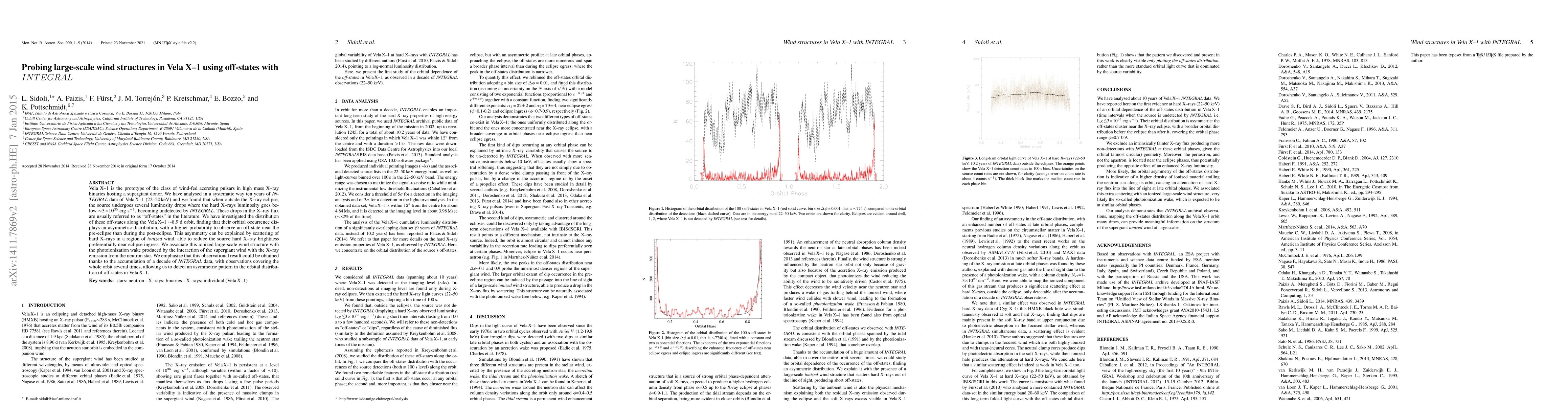 This paper analyzes ten years of INTEGRAL data on Vela X-1, revealing an asymmetric distribution of "off-states" in the pulsar's orbit, likely due to scattering of hard X-rays by an ionized wind. This wind structure is attributed to the photoionization wake from the supergiant donor's wind interacting with the neutron star's X-ray emission.