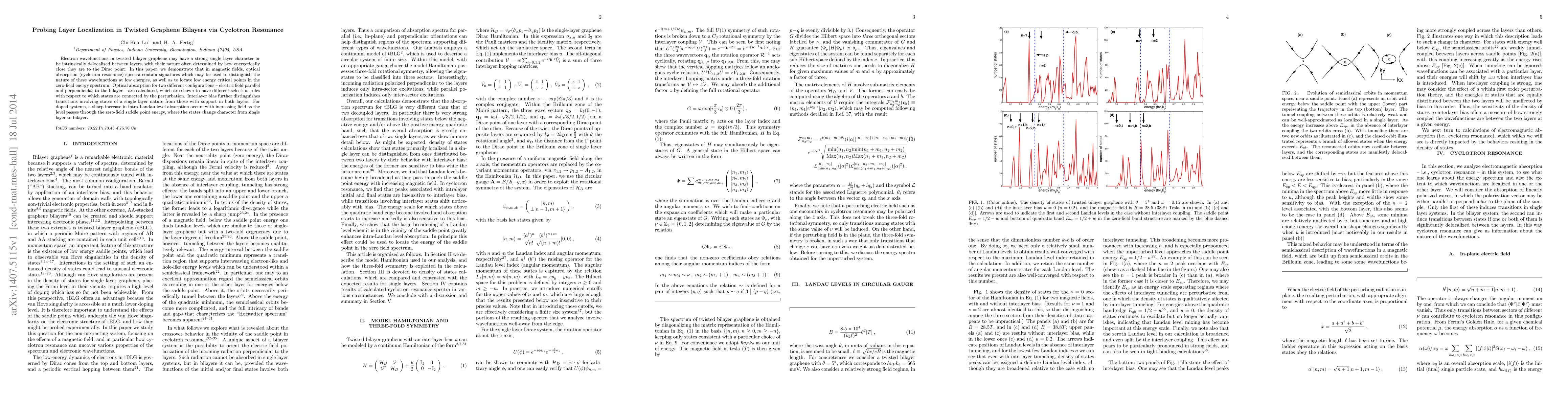 Electron wavefunctions in twisted bilayer graphene may have a strong single layer character or be intrinsically delocalized between layers, with their nature often determined by how energetically close they are to the Dirac point. In this paper, we demonstrate that in magnetic fields, optical absorption (cyclotron resonance) spectra contain signatures which may be used to distinguish the nature of these wavefunctions at low energies, as well as to locate low energy critical points in the zero-field energy spectrum. Optical absorption for two different configurations -- electric field parallel and perpendicular to the bilayer -- are calculated, which are shown to have different selection rules with respect to which states are connected by the perturbation. Interlayer bias further distinguishes transitions involving states of a single layer nature from those with support in both layers. For doped systems, a sharp increase in intra-Landau level absorption occurs with increasing field as the level passes through the zero-field saddle point energy, where the states change character from single layer to bilayer.