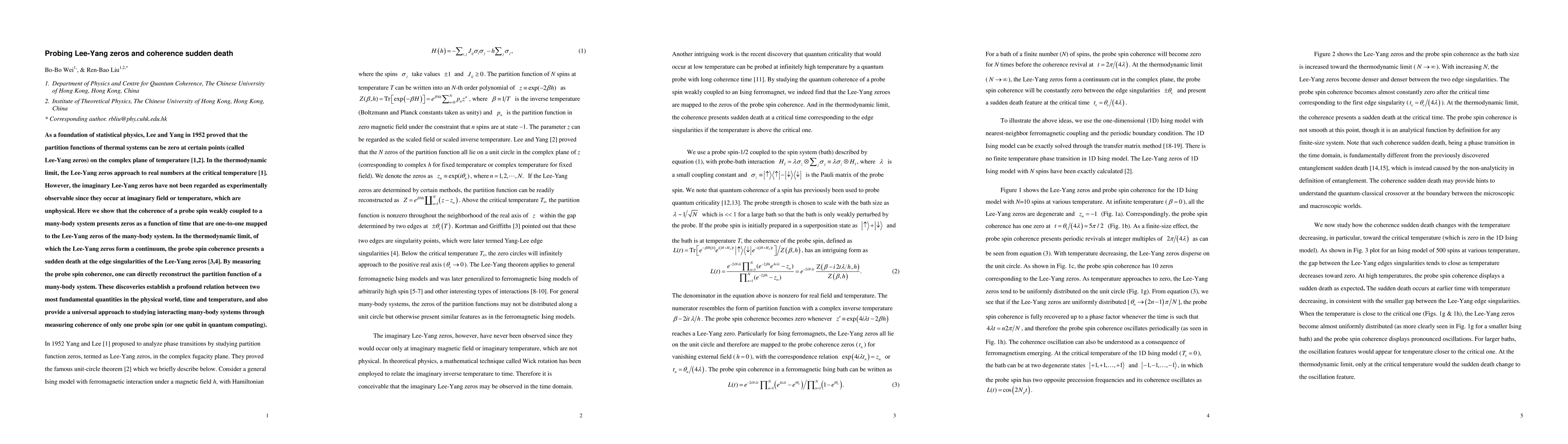 This research demonstrates that the coherence of a probe spin linked to a many-body system exhibits zeros corresponding to the Lee-Yang zeros of the system, enabling direct reconstruction of the partition function via probe spin coherence measurements. This approach provides a novel method for studying interacting many-body systems by observing the coherence of a single probe spin.
