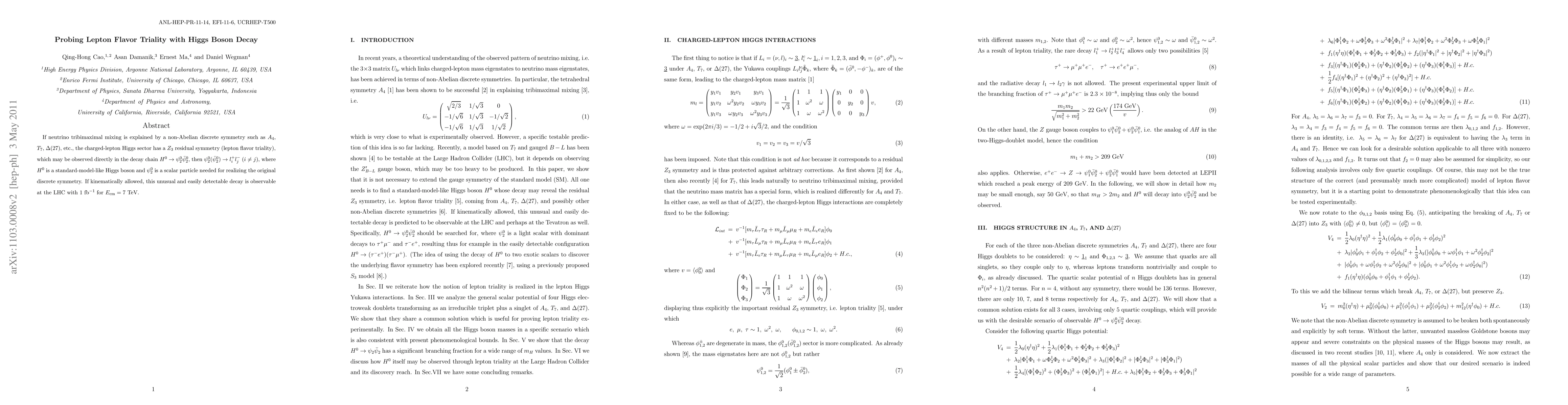 If neutrino tribimaximal mixing is explained by a non-Abelian discrete symmetry such as $A_4$, $T_7$, $\Delta(27)$, etc., the charged-lepton Higgs sector has a $Z_3$ residual symmetry (lepton flavor triality), which may be observed directly in the decay chain $H^0 \to \psi_2^0 \bar\psi_2^0$, then $\psi_2^0 (\bar\psi_2^0) \to l_i^+ l_j^- ~(i \neq j)$, where $H^0$ is a standard-model-like Higgs boson and $\psi_2^0$ is a scalar particle needed for realizing the original discrete symmetry. If kinematically allowed, this unusual and easily detectable decay is observable at the LHC with 1 fb$^{-1}$ for E_{cm} = 7 TeV.