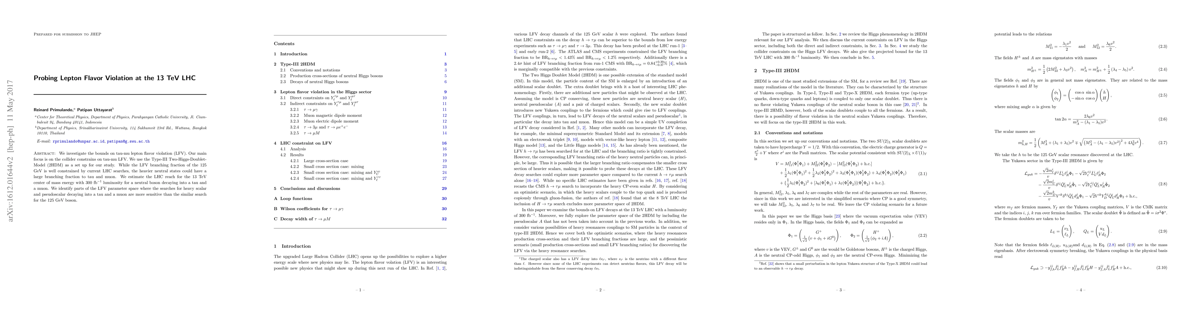 We investigate the bounds on tau-mu lepton flavor violation (LFV). Our main focus is on the collider constrains on tau-mu LFV. We use the Type-III Two-Higgs-Doublet-Model (2HDM) as a set up for our study. While the LFV branching fraction of the 125 GeV is well constrained by current LHC searches, the heavier neutral states could have a large branching fraction to tau and muon. We estimate the LHC reach for the 13 TeV center of mass energy with 300 $\text{fb}^{-1}$ luminosity for a neutral boson decaying into a tau and a muon. We identify parts of the LFV parameter space where the searches for heavy scalar and pseudoscalar decaying into a tau and a muon are more sensitive than the similar search for the 125 GeV boson.