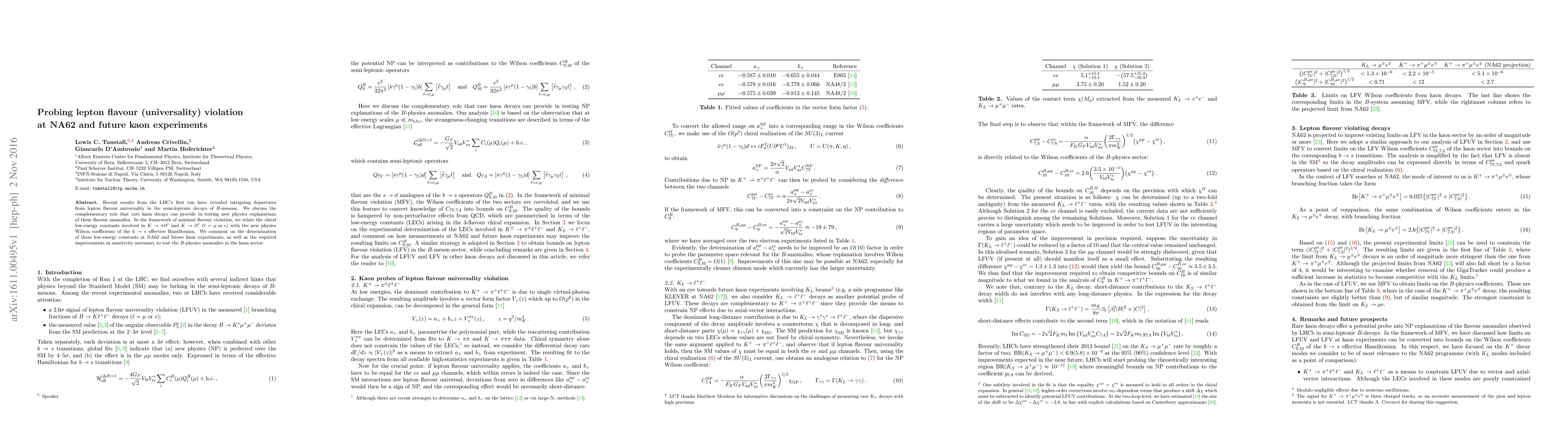 Recent results from the LHC's first run have revealed intriguing departures from lepton flavour universality in the semi-leptonic decays of $B$-mesons. We discuss the complementary role that rare kaon decays can provide in testing new physics explanations of these flavour anomalies. In the framework of minimal flavour violation, we relate the chiral low-energy constants involved in $K\to\pi\ell\ell'$ and $K\to\ell\ell'$ ($\ell = \mu \mbox{ or } e$) with the new physics Wilson coefficients of the $b\to s$ effective Hamiltonian. We comment on the determination of these low-energy constants at NA62 and future kaon experiments, as well as the required improvements in sensitivity necessary to test the $B$-physics anomalies in the kaon sector.