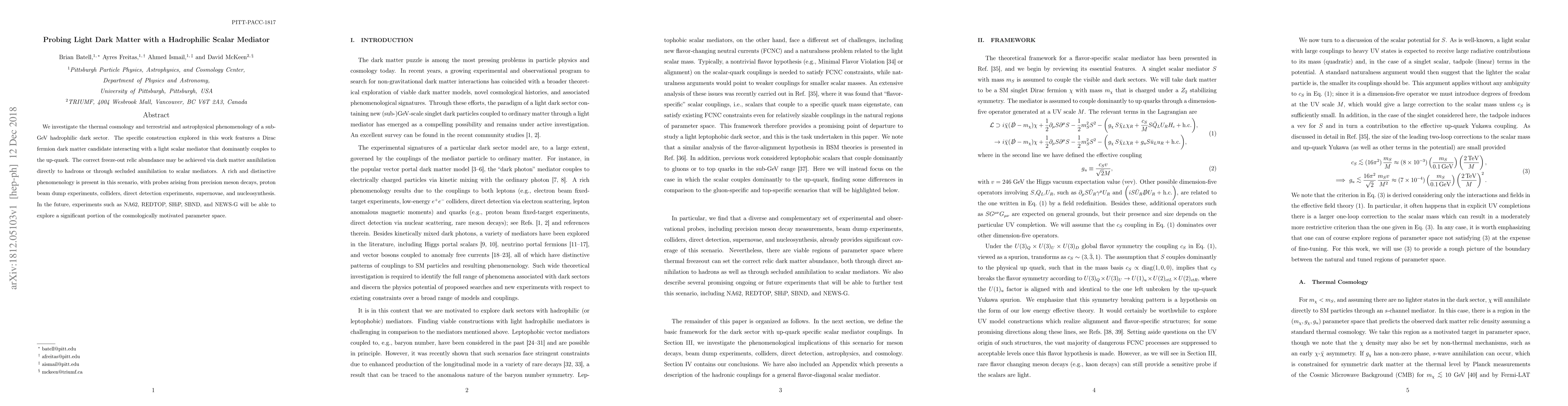 This paper explores a sub-GeV hadrophilic dark sector with a Dirac fermion dark matter candidate interacting via a light scalar mediator primarily coupling to the up-quark. It examines the potential for achieving the correct relic abundance through various annihilation processes and highlights the rich phenomenology accessible through diverse experimental probes.