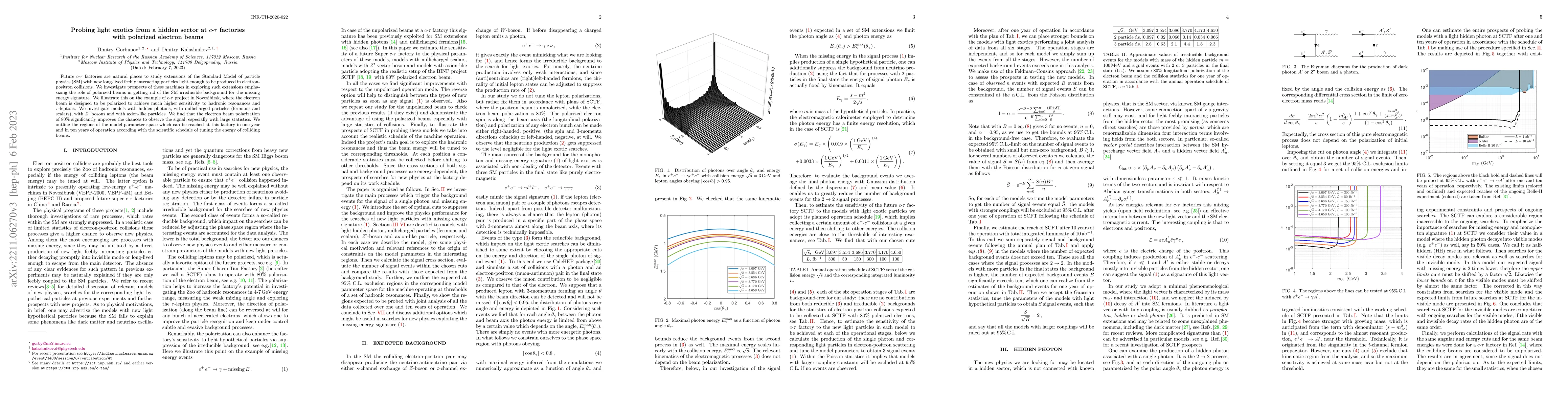 This paper explores the potential of future $c$-$\tau$ factories to study new physics beyond the Standard Model using polarized electron beams, which help reduce background noise. The study focuses on detecting light exotic particles like hidden photons, millicharged particles, $Z'$ bosons, and axion-like particles, finding that 80% polarized beams significantly enhance detection prospects.