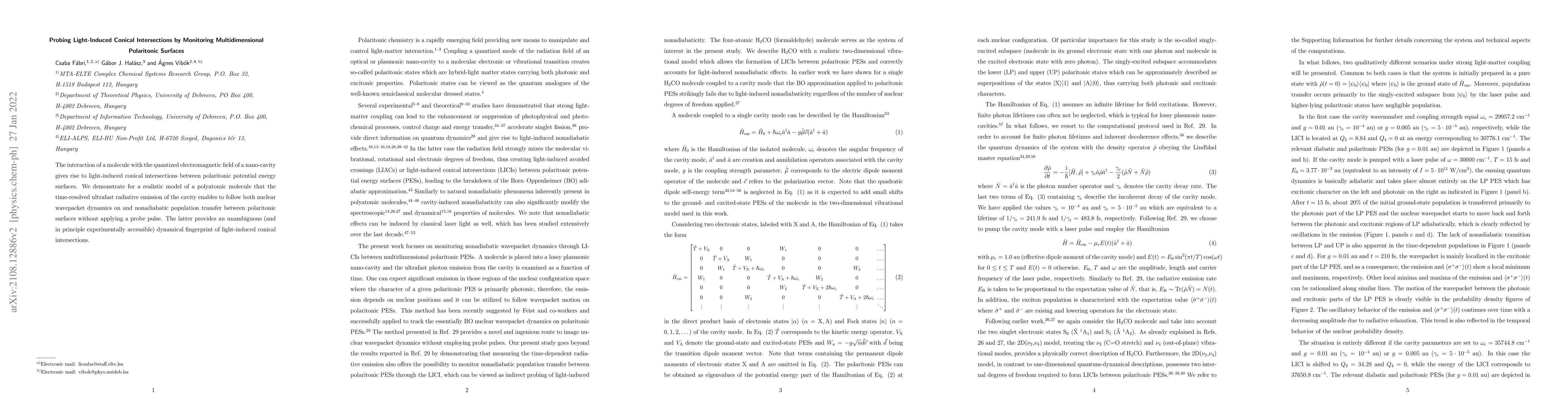 This paper investigates light-induced conical intersections in a polyatomic molecule by monitoring the time-resolved ultrafast radiative emission from a nano-cavity. It reveals nuclear wavepacket dynamics and nonadiabatic population transfer between polaritonic surfaces without requiring a probe pulse, offering a direct method to detect these intersections.