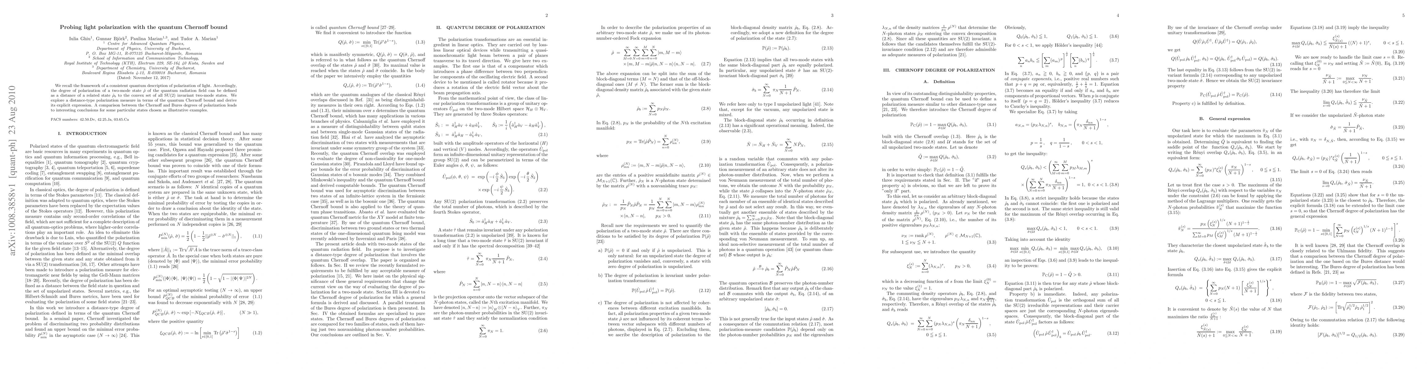 We recall the framework of a consistent quantum description of polarization of light. Accordingly, the degree of polarization of a two-mode state $\hat \rho$ of the quantum radiation field can be defined as a distance of a related state ${\hat \rho}_b$ to the convex set of all SU(2) invariant two-mode states. We explore a distance-type polarization measure in terms of the quantum Chernoff bound and derive its explicit expression. A comparison between the Chernoff and Bures degrees of polarization leads to interesting conclusions for some particular states chosen as illustrative examples.