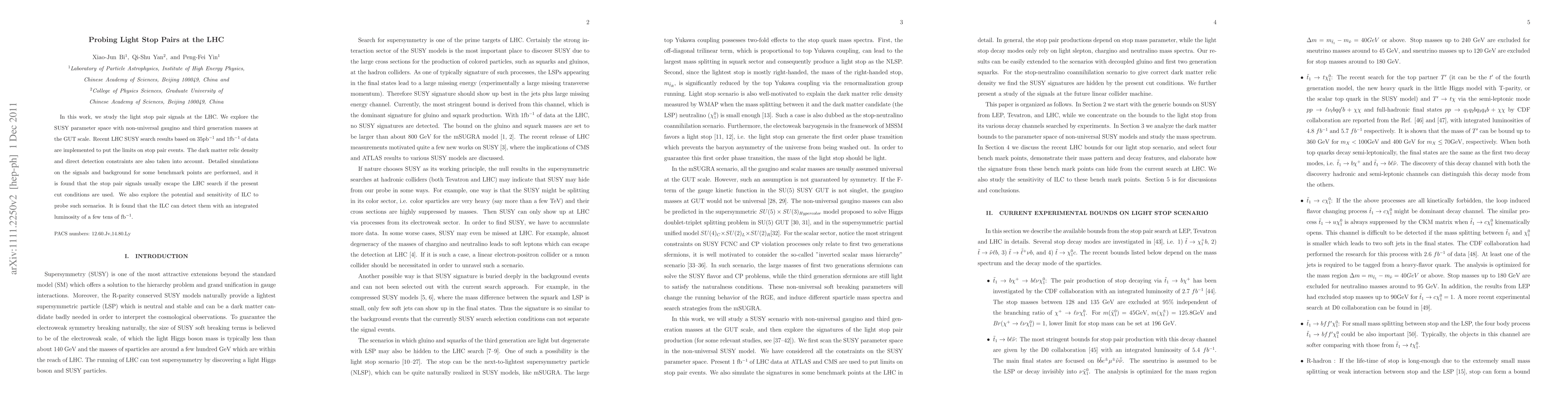 In this work, we study the light stop pair signals at the LHC. We explore the SUSY parameter space with non-universal gaugino and third generation masses at the GUT scale. Recent LHC SUSY search results based on 35pb$^{-1}$ and 1fb$^{-1}$ of data are implemented to put the limits on stop pair events. The dark matter relic density and direct detection constraints are also taken into account. Detailed simulations on the signals and background for some benchmark points are performed, and it is found that the stop pair signals usually escape the LHC search if the present cut conditions are used. We also explore the potential and sensitivity of ILC to probe such scenarios. It is found that the ILC can detect them with an integrated luminosity of a few tens of fb$^{-1}$.