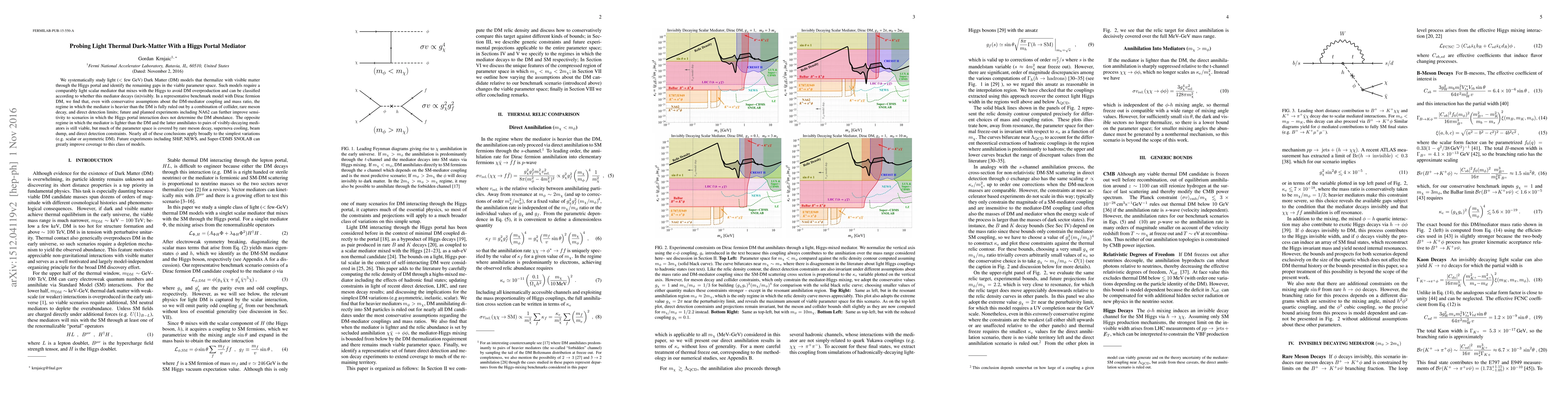 This paper investigates light (< few GeV) thermal dark matter models that interact with visible matter via the Higgs portal, finding that the regime where the mediator is heavier than the dark matter is largely ruled out by current experimental limits. Future experiments like NA62, SHiP, NEWS, and Super-CDMS SNOLAB are expected to further constrain the remaining viable parameter space.