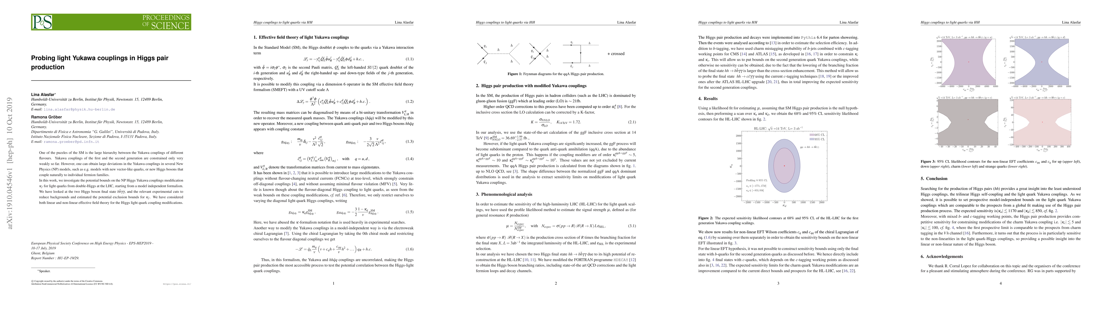 This paper explores the potential to probe modifications in Yukawa couplings for light quarks via Higgs pair production at the LHC, focusing on the final state $b\bar{b}\gamma\gamma$. It investigates both linear and non-linear effective field theories to estimate exclusion bounds for new physics models that could significantly alter these couplings.