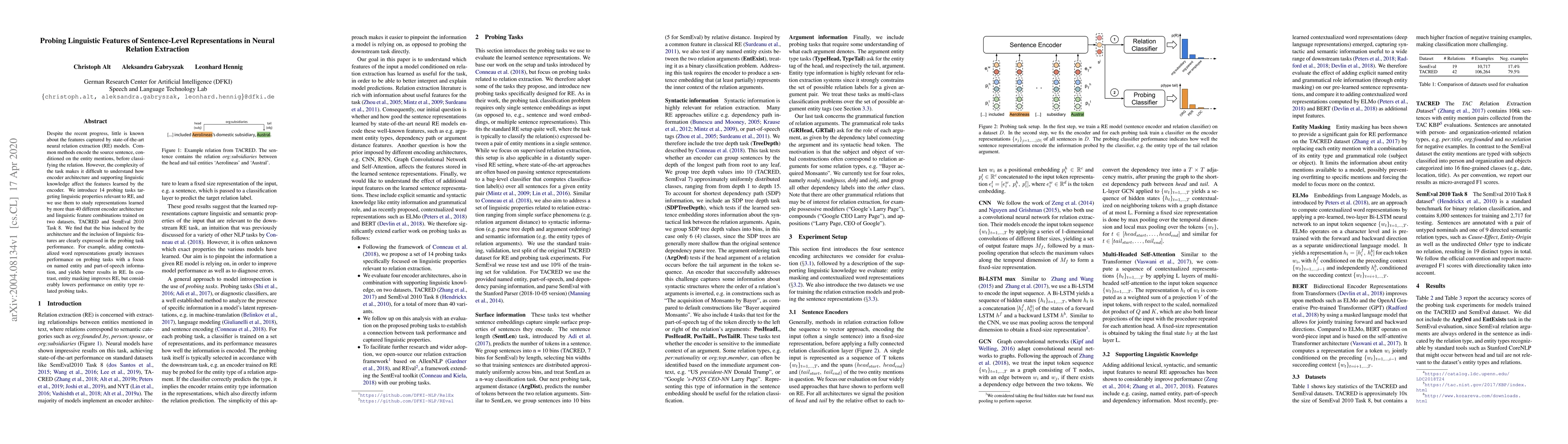 Despite the recent progress, little is known about the features captured by state-of-the-art neural relation extraction (RE) models. Common methods encode the source sentence, conditioned on the entity mentions, before classifying the relation. However, the complexity of the task makes it difficult to understand how encoder architecture and supporting linguistic knowledge affect the features learned by the encoder. We introduce 14 probing tasks targeting linguistic properties relevant to RE, and we use them to study representations learned by more than 40 different encoder architecture and linguistic feature combinations trained on two datasets, TACRED and SemEval 2010 Task 8. We find that the bias induced by the architecture and the inclusion of linguistic features are clearly expressed in the probing task performance. For example, adding contextualized word representations greatly increases performance on probing tasks with a focus on named entity and part-of-speech information, and yields better results in RE. In contrast, entity masking improves RE, but considerably lowers performance on entity type related probing tasks.