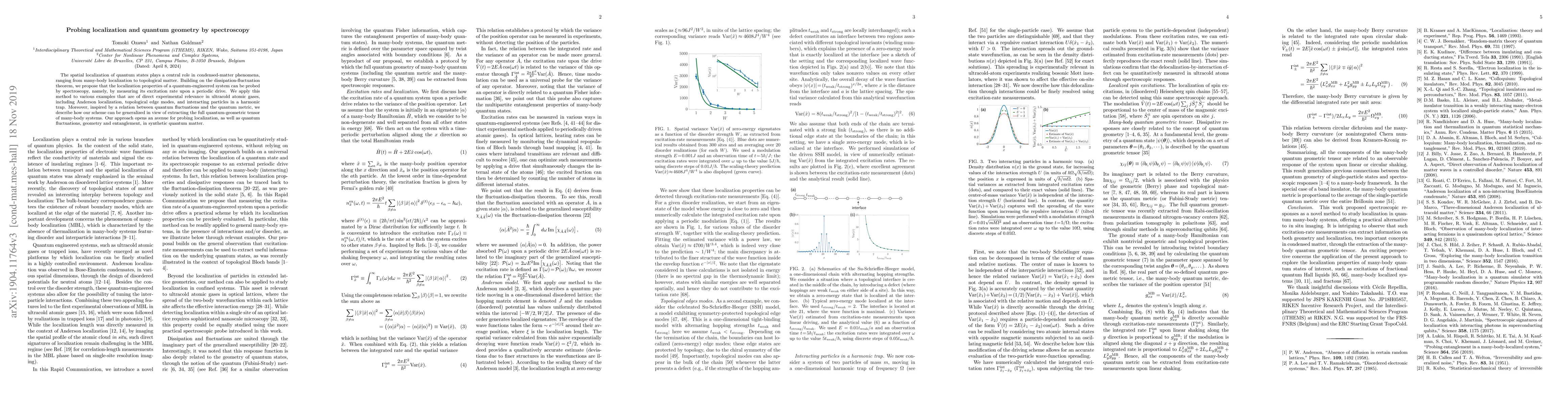 The spatial localization of quantum states plays a central role in condensed-matter phenomena, ranging from many-body localization to topological matter. Building on the dissipation-fluctuation theorem, we propose that the localization properties of a quantum-engineered system can be probed by spectroscopy, namely, by measuring its excitation rate upon a periodic drive. We apply this method to various examples that are of direct experimental relevance in ultracold atomic gases, including Anderson localization, topological edge modes, and interacting particles in a harmonic trap. Moreover, inspired by a relation between quantum fluctuations and the quantum metric, we describe how our scheme can be generalized in view of extracting the full quantum-geometric tensor of many-body systems. Our approach opens an avenue for probing localization, as well as quantum fluctuations, geometry and entanglement, in synthetic quantum matter.