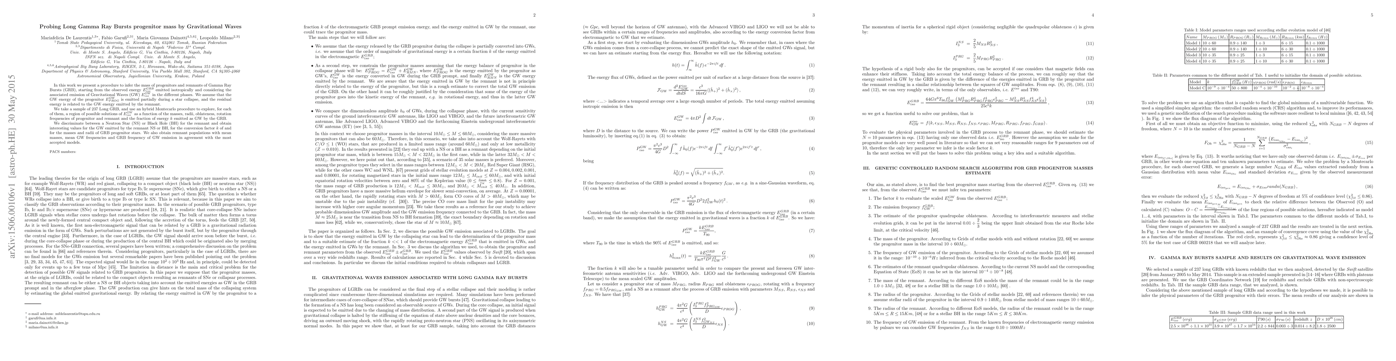 In this work we present a procedure to infer the mass of progenitors and remnants of Gamma Ray Bursts (GRB), starting from the observed energy $E_{iso}^{GRB}$ emitted isotropically and considering the associated emission of Gravitational Waves (GW) $ E_{iso}^{GW}$ in the different phases. We assume that the GW energy of the progenitor $E_{PROG}^{GW}$ is emitted partially during a star collapse, and the residual energy is related to the GW energy emitted by the remnant. We take a sample of $237$ Long GRB, and use an hybrid Montecarlo procedure to explore, for each of them, a region of possible solutions of $ E_{iso}^{GW}$ as a function of the masses, radii, oblateness, rotation frequencies of progenitor and remnant and the fraction of energy $k$ emitted as GW by the GRB. We discriminate between a Neutron Star (NS) or Black Hole (BH) for the remnant and obtain interesting values for the GW emitted by the remnant NS or BH, for the conversion factor $k$ of and for the masses and radii of GRB progenitor stars. We also obtain remnant populations with mean masses, mean GW frequencies and GRB frequency of GW emission in agreement with the most accepted models.