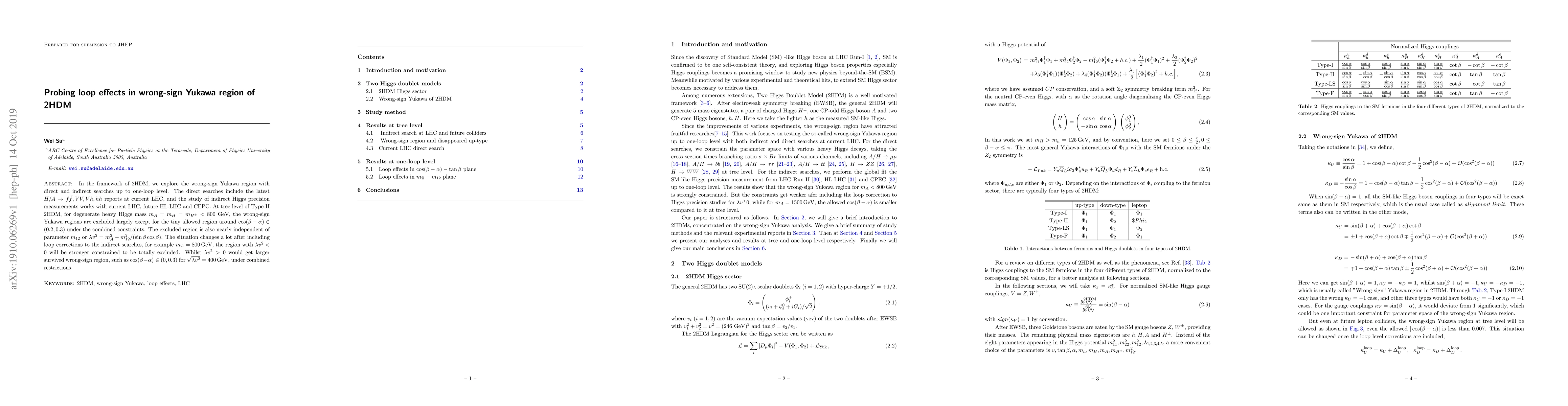 In the framework of 2HDM, we explore the wrong-sign Yukawa region with direct and indirect searches up to one-loop level. The direct searches include the latest $H/A \to f\bar f, VV, Vh, hh$ reports at current LHC, and the study of indirect Higgs precision measurements works with current LHC, future HL-LHC and CEPC. At tree level of Type-II 2HDM, for degenerate heavy Higgs mass $m_A=m_H=m_{H^\pm}<800$ GeV, the wrong-sign Yukawa regions are excluded largely except for the tiny allowed region around $\cos(\beta-\alpha)\in(0.2,0.3)$ under the combined constraints. The excluded region is also nearly independent of parameter $m_{12}$ or $\lambda v^2=m_A^2-m_{12}^2/(\sin \beta \cos \beta)$. The situation changes a lot after including loop corrections to the indirect searches, for example $m_A=800 $ GeV, the region with $\lambda v^2<0$ will be stronger constrained to be totally excluded. Whilst $\lambda v^2>0$ would get larger survived wrong-sign region, such as $\cos(\beta-\alpha) \in (0,0.3)$ for $\sqrt{\lambda v^2}=400$ GeV, under combined restrictions.