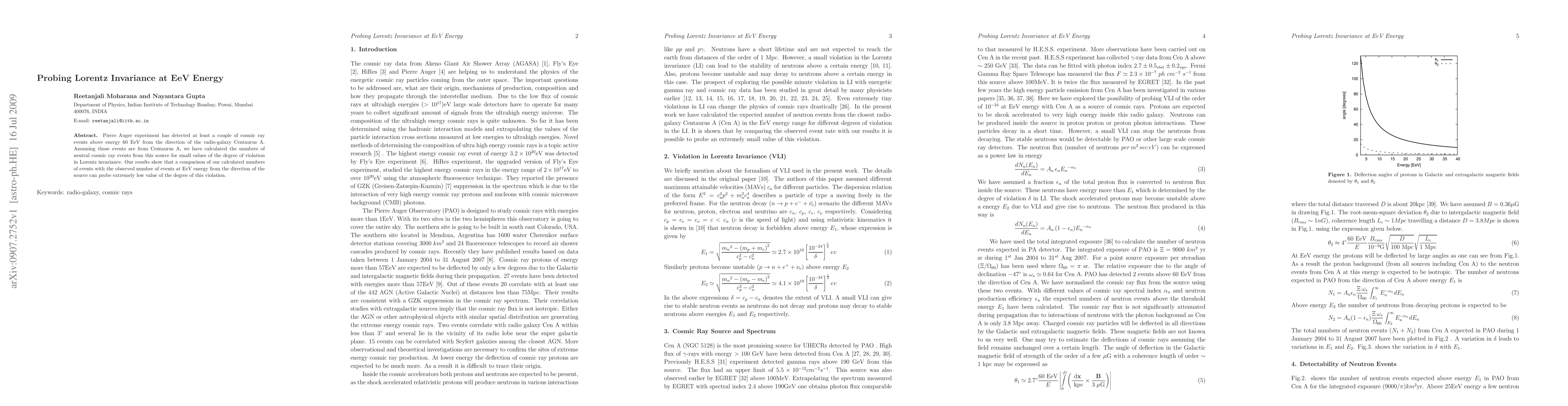 Pierre Auger experiment has detected at least a couple of ray events above energy 60 EeV from the direction of the radio-galaxy Centaurus A. Assuming those events are from Centaurus A, we have calculated the number of neutral cosmic ray events from this source for small values of the degree of violation in Lorentz invariance. Our results show that a comparison of our calculated numbers of events with the observed number of events at EeV energy from the direction of the source can probe extremely low value of the degree of this violation.