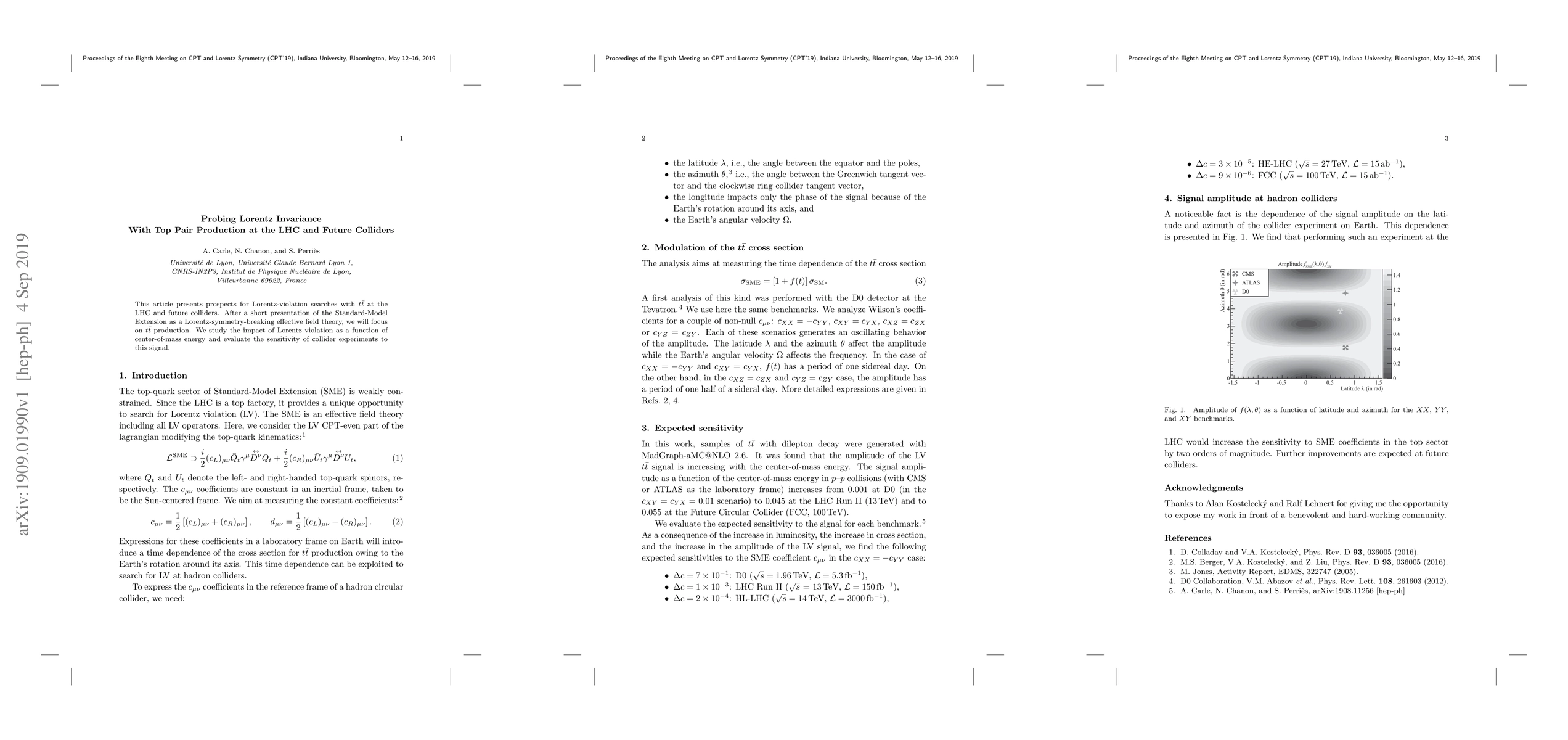 This paper explores the potential of top quark pair production at the LHC and future colliders to probe Lorentz invariance violations using the Standard-Model Extension. It evaluates the sensitivity of these experiments to detect such violations as a function of center-of-mass energy.