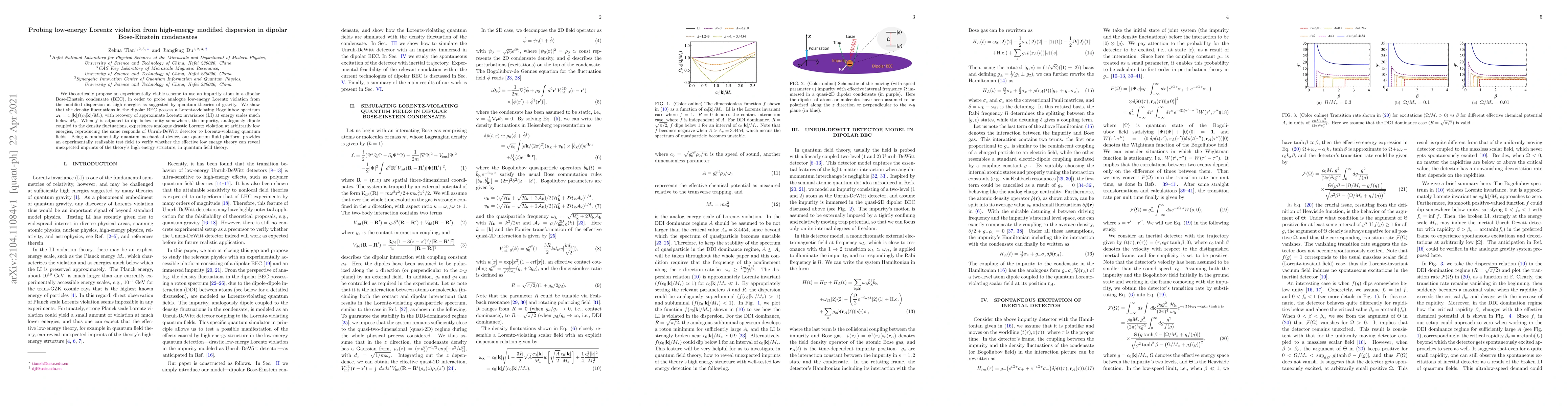 This paper proposes a method to probe low-energy Lorentz violation using dipolar Bose-Einstein condensates with an impurity atom, revealing modified dispersion at high energies. The density fluctuations in the condensate exhibit a Lorentz-violating Bogoliubov spectrum, providing a testable platform to verify high-energy quantum gravity theories at low energies.