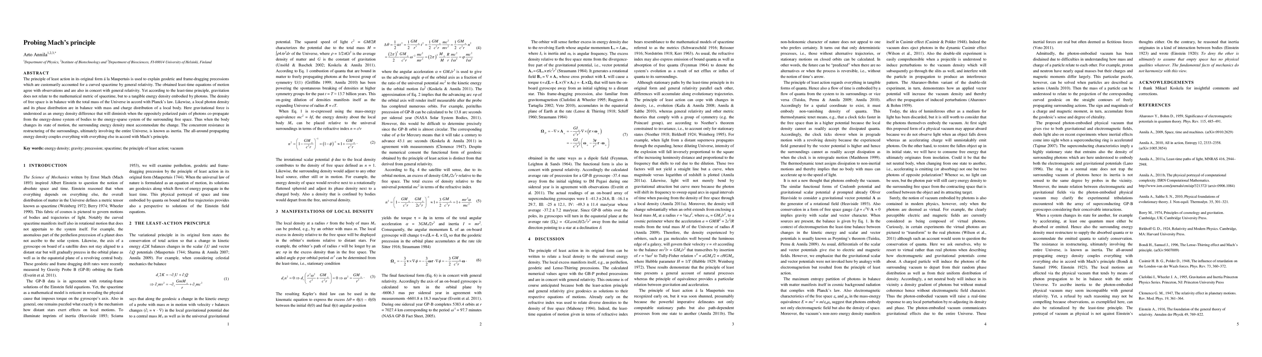 The principle of least action in its original form \'a la Maupertuis is used to explain geodetic and frame-dragging precessions which are customarily accounted for a curved spacetime by general relativity. The obtained least-time equations of motion agree with observations and are also in concert with general relativity. Yet according to the least-time principle, gravitation does not relate to the mathematical metric of spacetime, but to a tangible energy density embodied by photons. The density of free space is in balance with the total mass of the Universe in accord with Planck's law. Likewise, a local photon density and its phase distribution are in balance with mass and charge distribution of a local body. Here gravitational force is understood as an energy density difference that will diminish when the oppositely polarized pairs of photons co-propagate from the energy-dense system of bodies to the energy-sparse system of the surrounding free space. Thus when the body changes its state of motion, the surrounding energy density must accommodate the change. The concurrent resistance in restructuring of the surroundings, ultimately involving the entire Universe, is known as inertia. The all-around propagating energy density couples everything with everything else in accord with Mach's principle.
