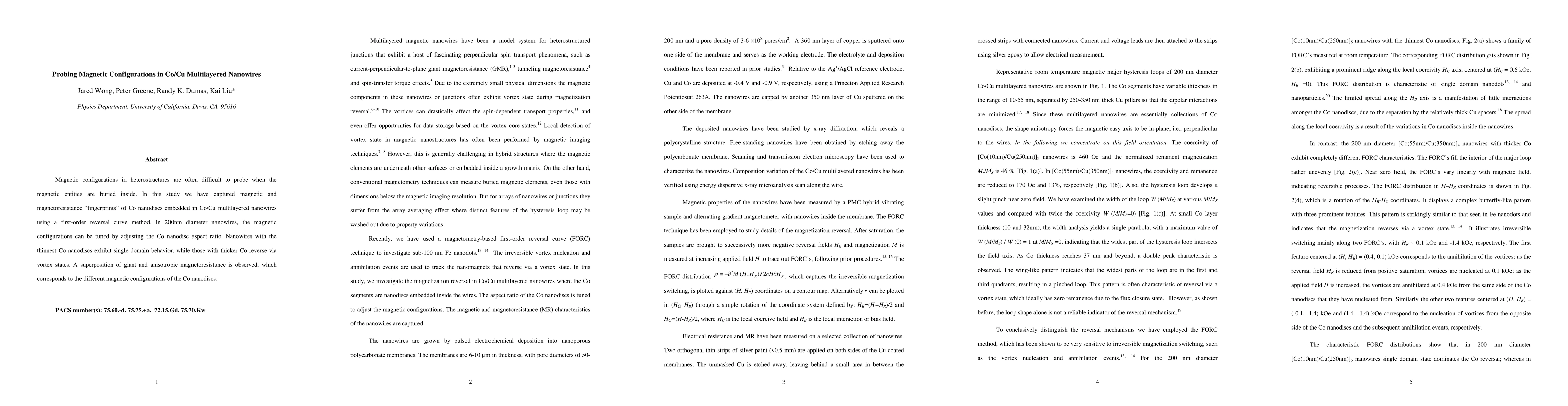 Magnetic configurations in heterostructures are often difficult to probe when the magnetic entities are buried inside. In this study we have captured magnetic and magnetoresistance "fingerprints" of Co nanodiscs embedded in Co/Cu multilayered nanowires using a first-order reversal curve method. In 200nm diameter nanowires, the magnetic configurations can be tuned by adjusting the Co nanodisc aspect ratio. Nanowires with the thinnest Co nanodiscs exhibit single domain behavior, while those with thicker Co reverse via vortex states. A superposition of giant and anisotropic magnetoresistance is observed, which corresponds to the different magnetic configurations of the Co nanodiscs.