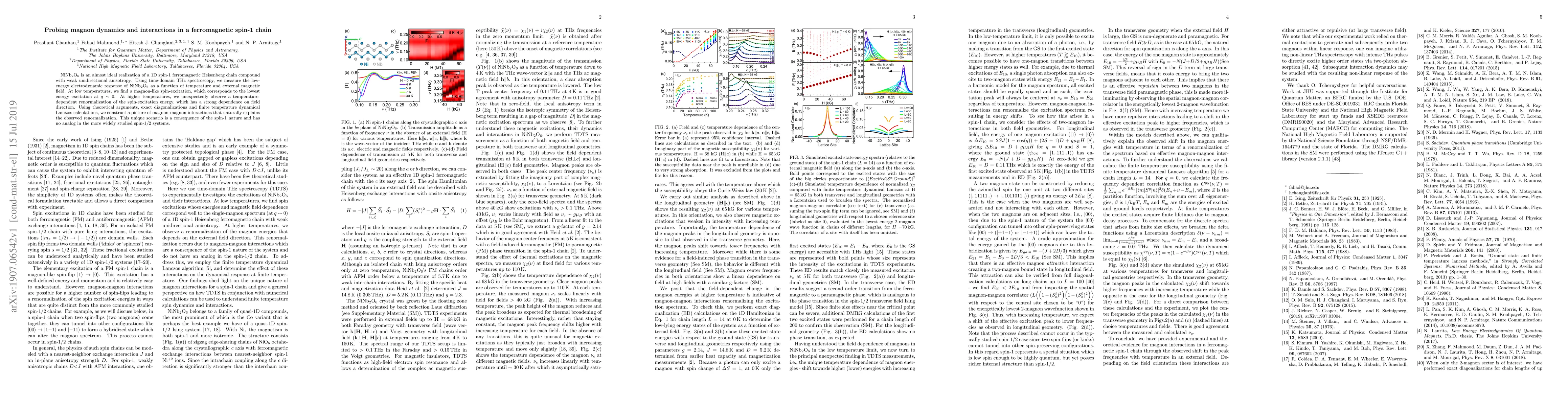 This study uses time-domain THz spectroscopy to examine NiNb2O6, an almost ideal spin-1 ferromagnetic Heisenberg chain. It discovers a magnon-like excitation at low temperatures and a temperature-dependent renormalization of spin-excitation energy at higher temperatures, influenced by magnetic field direction. The findings suggest unique magnon-magnon interactions due to the spin-1 nature, distinct from spin-1/2 systems.