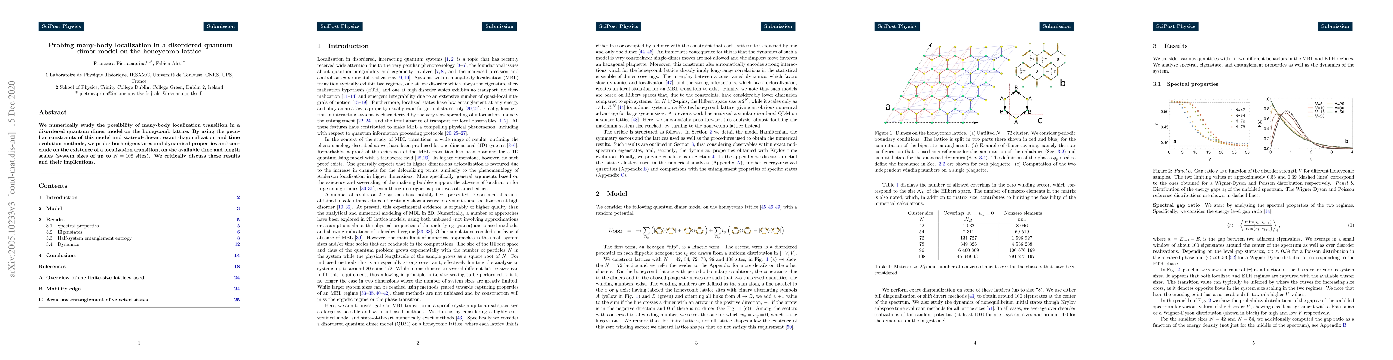 This research numerically investigates the many-body localization transition in a disordered quantum dimer model on the honeycomb lattice, employing advanced exact diagonalization and time evolution techniques. The study finds evidence of a localization transition within the explored system sizes up to N=108 sites, highlighting significant implications for the model's eigenstates and dynamics.