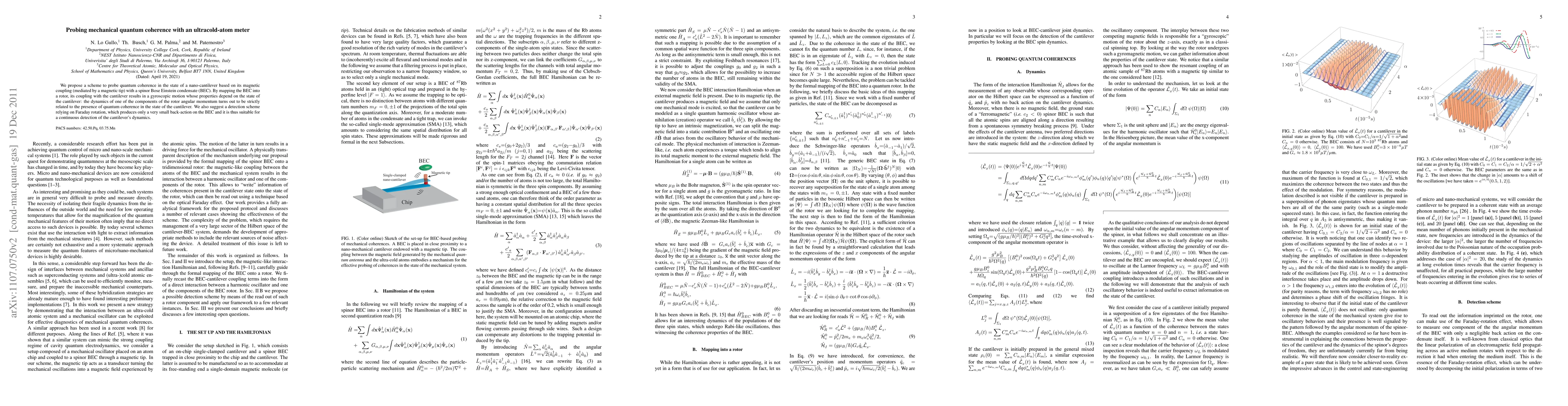 We propose a scheme to probe quantum coherence in the state of a nano-cantilever based on its magnetic coupling (mediated by a magnetic tip) with a spinor Bose Einstein condensate (BEC). By mapping the BEC into a rotor, its coupling with the cantilever results in a gyroscopic motion whose properties depend on the state of the cantilever: the dynamics of one of the components of the rotor angular momentum turns out to be strictly related to the presence of quantum coherence in the state of the cantilever. We also suggest a detection scheme relying on Faraday rotation, which produces only a very small back-action on the BEC and it is thus suitable for a continuous detection of the cantilever's dynamics.