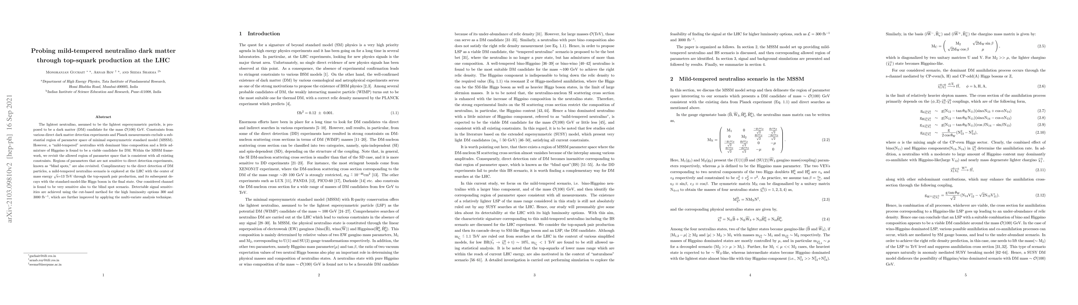 This research explores a 'mild-tempered' neutralino, a dark matter candidate with bino and Higgsino composition, evading direct detection constraints. It revisits 'blind spots' in MSSM parameter space and investigates top-squark production at the LHC for detecting such neutralinos, finding high sensitivity with cut-based methods and improved results using multi-variate analysis techniques for high luminosity options.