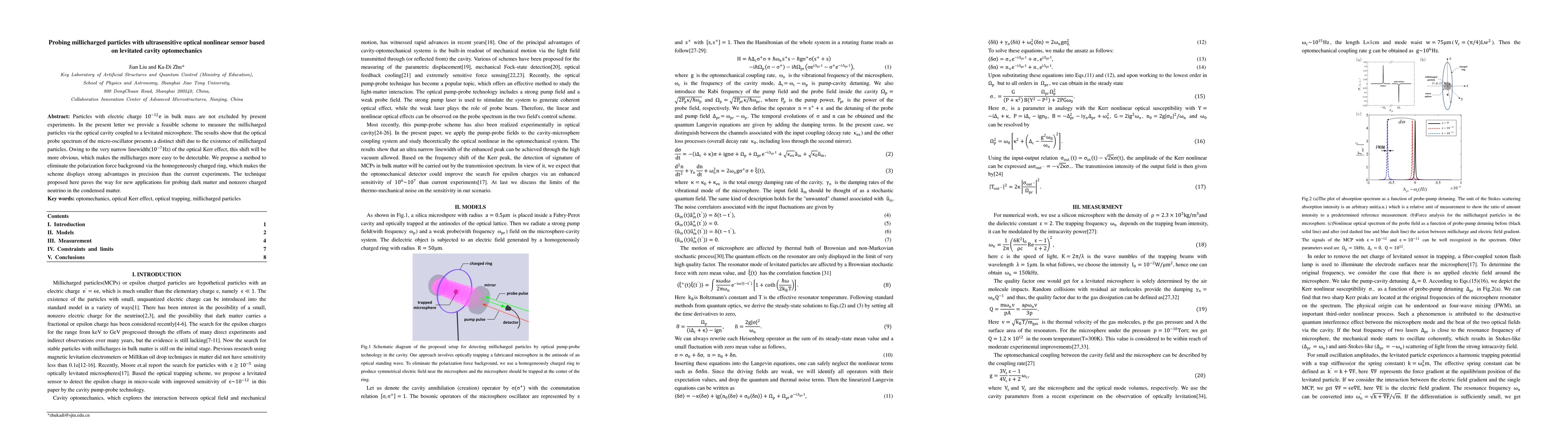 Particles with electric charge 10^(-12)e in bulk mass are not excluded by present experiments. In the present letter we provide a feasible scheme to measure the millicharged particles via the optical cavity coupled to a levitated microsphere. The results show that the optical probe spectrum of the micro-oscillator presents a distinct shift due to the existence of millicharged particles. Owing to the very narrow linewidth(10^(-7) Hz) of the optical Kerr effect, this shift will be more obvious, which makes the millicharges more easy to be detectable. We propose a method to eliminate the polarization force background via the homogeneously charged ring, which makes the scheme displays strong advantages in precision than the current experiments. The technique proposed here paves the way for new applications for probing dark matter and nonzero charged neutrino in the condensed matter.