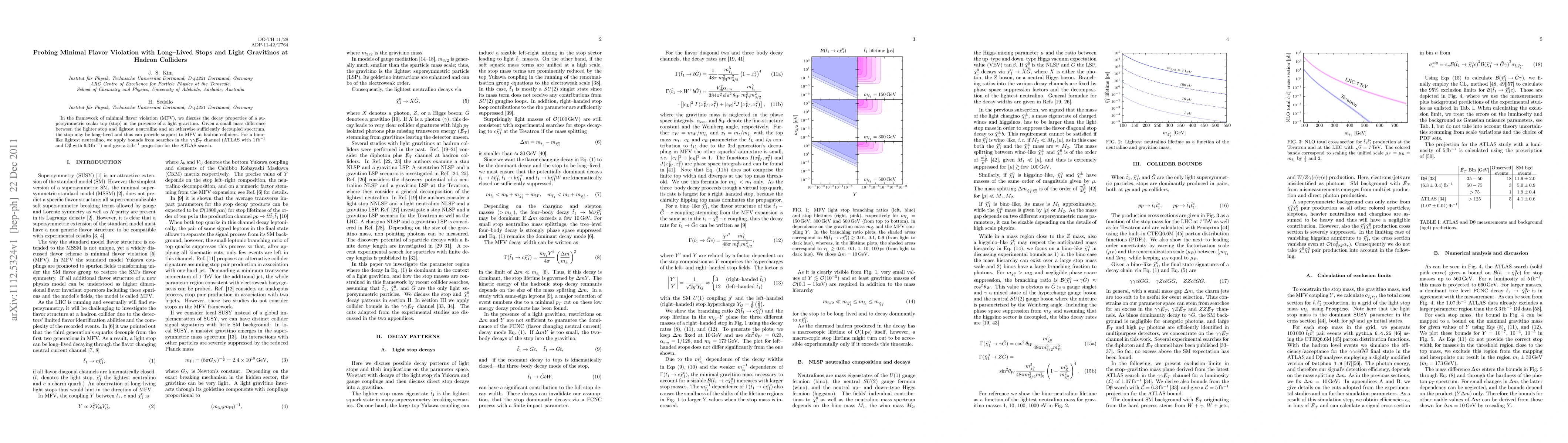 In the framework of minimal flavor violation (MFV), we discuss the decay properties of a supersymmetric scalar top (stop) in the presence of a light gravitino. Given a small mass difference between the lighter stop and lightest neutralino and an otherwise sufficiently decoupled spectrum, the stop may be long-lived and thus can provide support to MFV at hadron colliders. For a bino-like lightest neutralino, we apply bounds from searches in the gamma gamma plus missing transverse energy channel (ATLAS with 1 fb^-1 and D0 with 6.3 fb^-1) and give a 5 fb^-1 projection for the ATLAS search.