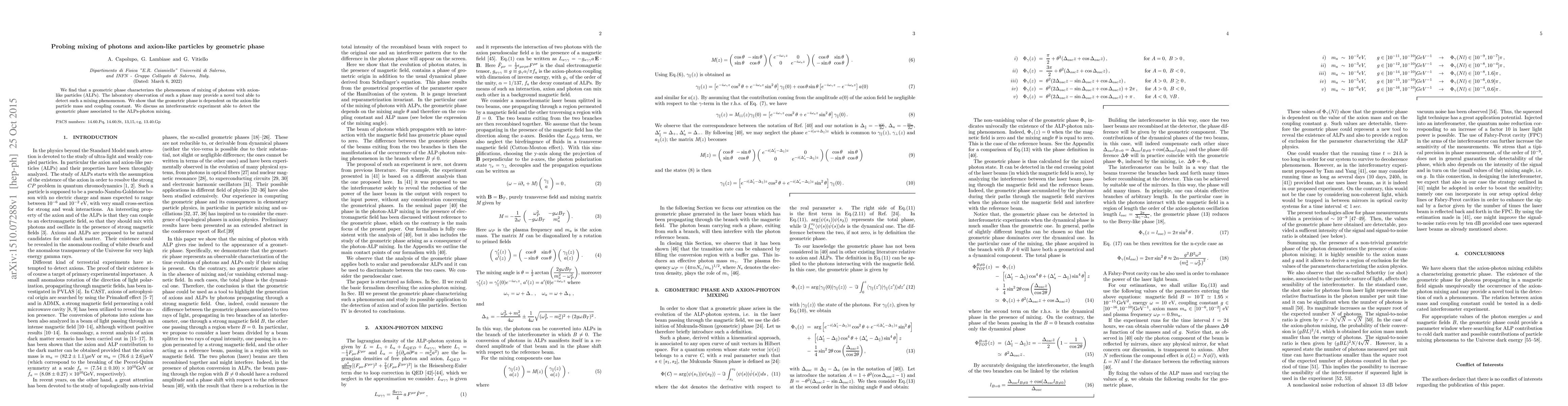 This paper demonstrates that a geometric phase can characterize the mixing of photons with axion-like particles (ALPs) and proposes an interferometric experiment to detect this phase, which depends on ALP mass and coupling constant, offering a novel method for detecting such mixing phenomena.