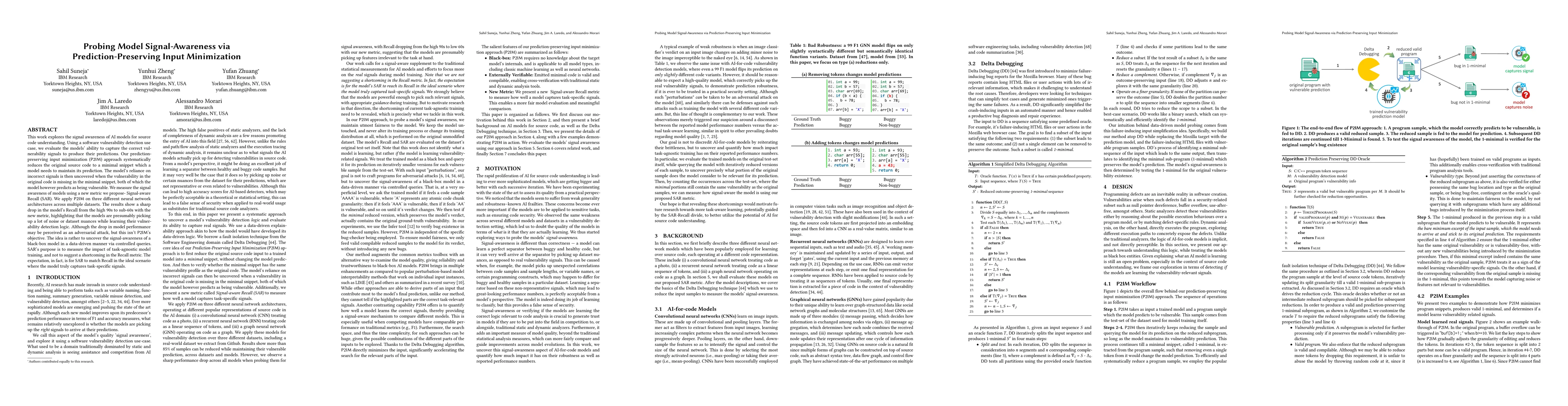This work explores the signal awareness of AI models for source code understanding. Using a software vulnerability detection use case, we evaluate the models' ability to capture the correct vulnerability signals to produce their predictions. Our prediction-preserving input minimization (P2IM) approach systematically reduces the original source code to a minimal snippet which a model needs to maintain its prediction. The model's reliance on incorrect signals is then uncovered when the vulnerability in the original code is missing in the minimal snippet, both of which the model however predicts as being vulnerable. We measure the signal awareness of models using a new metric we propose- Signal-aware Recall (SAR). We apply P2IM on three different neural network architectures across multiple datasets. The results show a sharp drop in the model's Recall from the high 90s to sub-60s with the new metric, highlighting that the models are presumably picking up a lot of noise or dataset nuances while learning their vulnerability detection logic. Although the drop in model performance may be perceived as an adversarial attack, but this isn't P2IM's objective. The idea is rather to uncover the signal-awareness of a black-box model in a data-driven manner via controlled queries. SAR's purpose is to measure the impact of task-agnostic model training, and not to suggest a shortcoming in the Recall metric. The expectation, in fact, is for SAR to match Recall in the ideal scenario where the model truly captures task-specific signals.