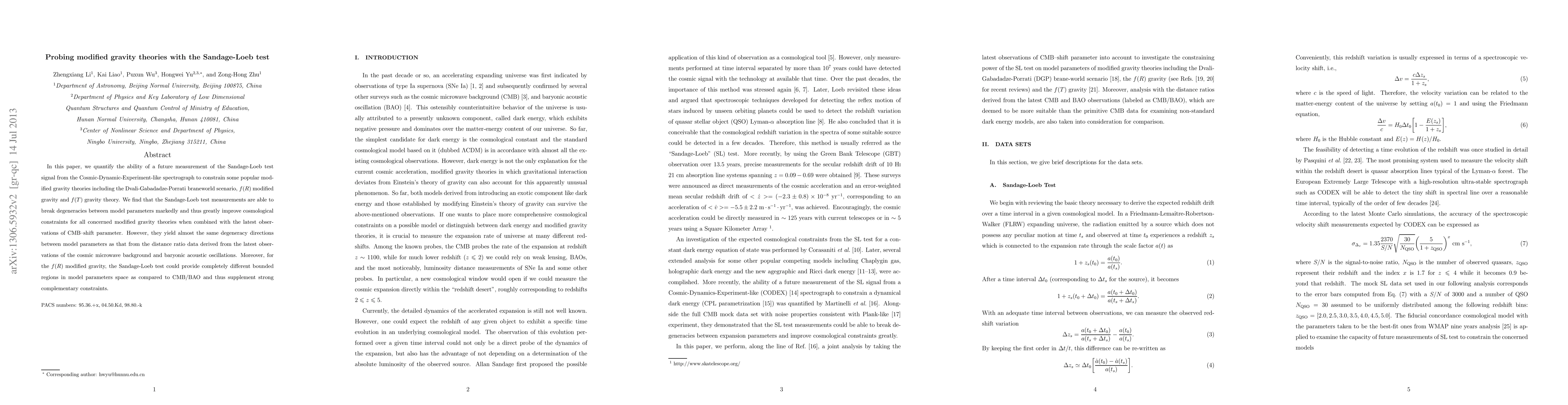 In this paper, we quantify the ability of a future measurement of the Sandage-Loeb test signal from the Cosmic-Dynamic-Experiment-like spectrograph to constrain some popular modified gravity theories including DGP brane-world scenario, $f(R)$ modified gravity and $f(T)$ gravity theory. We find that the Sandage-Loeb test measurements are able to break degeneracies between model parameters markedly and thus greatly improve cosmological constraints for all concerned modified gravity theories when combined with the latest observations of CMB--shift parameter. However, they yield almost the same degeneracy directions between model parameters as that from the distance ratio data derived from the latest observations of the cosmic microwave background and baryonic acoustic oscillations (CMB/BAO). Moreover, for the $f(R)$ modified gravity, the Sandage-Loeb test could provide completely different bounded regions in model parameters space as compared to CMB/BAO and thus supplement strong complementary constraints.