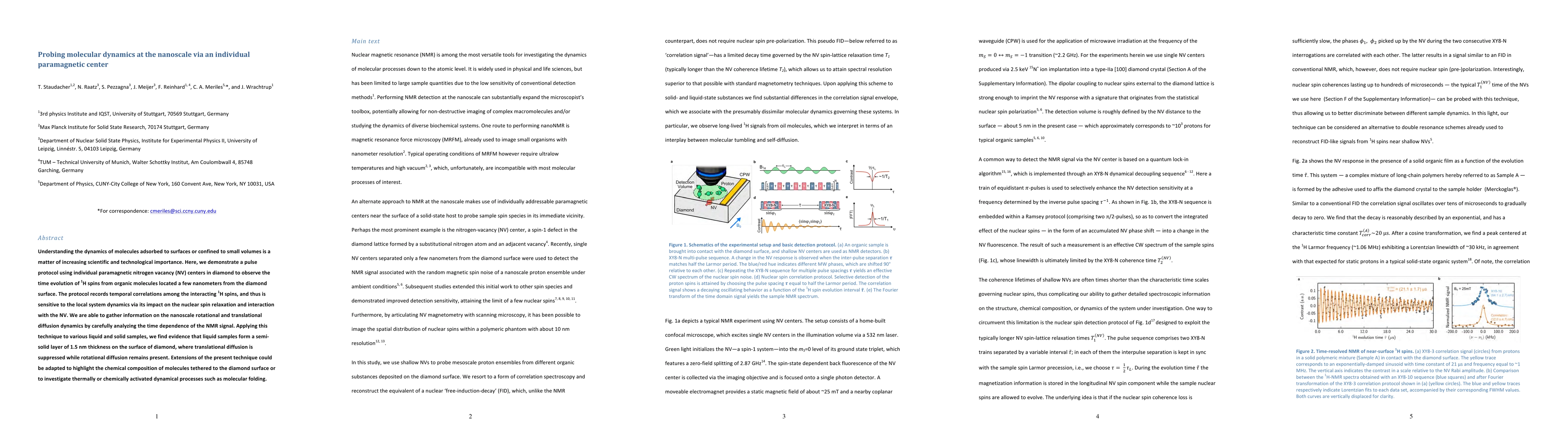 Understanding the dynamics of molecules adsorbed to surfaces or confined to small volumes is a matter of increasing scientific and technological importance. Here, we demonstrate a pulse protocol using individual paramagnetic nitrogen vacancy (NV) centers in diamond to observe the time evolution of 1H spins from organic molecules located a few nanometers from the diamond surface. The protocol records temporal correlations among the interacting 1H spins, and thus is sensitive to the local system dynamics via its impact on the nuclear spin relaxation and interaction with the NV. We are able to gather information on the nanoscale rotational and translational diffusion dynamics by carefully analyzing the time dependence of the NMR signal. Applying this technique to various liquid and solid samples, we find evidence that liquid samples form a semi-solid layer of 1.5 nm thickness on the surface of diamond, where translational diffusion is suppressed while rotational diffusion remains present. Extensions of the present technique could be adapted to highlight the chemical composition of molecules tethered to the diamond surface or to investigate thermally or chemically activated dynamical processes such as molecular folding.