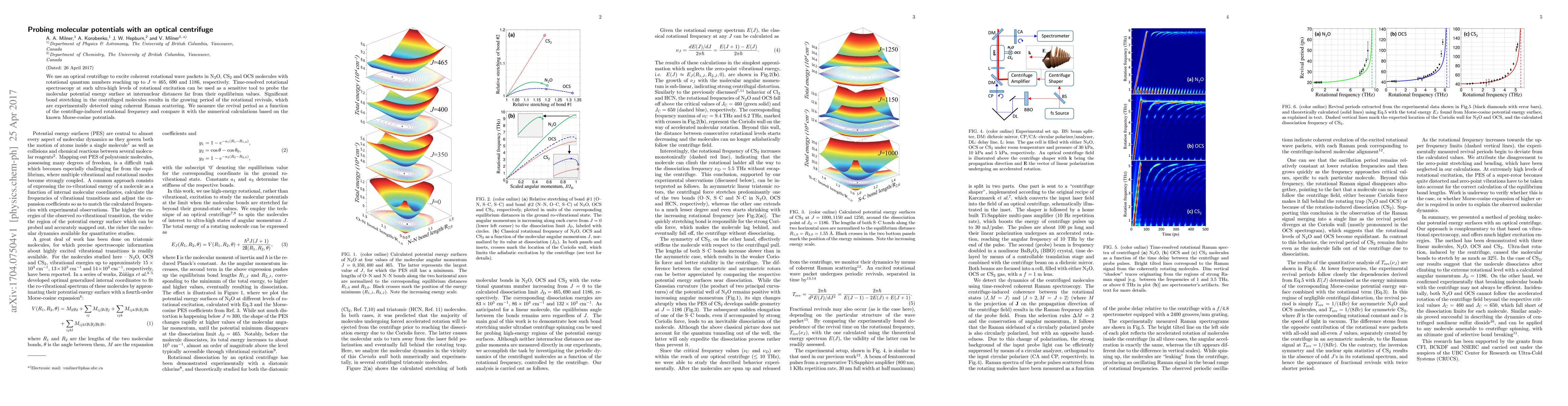 This paper explores the use of an optical centrifuge to excite high-rotational states in N$_2$O, CS$_2$, and OCS molecules, employing time-resolved spectroscopy to probe their potential energy surfaces at extreme inter-nuclear distances. The study reveals significant bond stretching and measures the rotational revival period, comparing it to theoretical calculations based on Morse-cosine potentials.