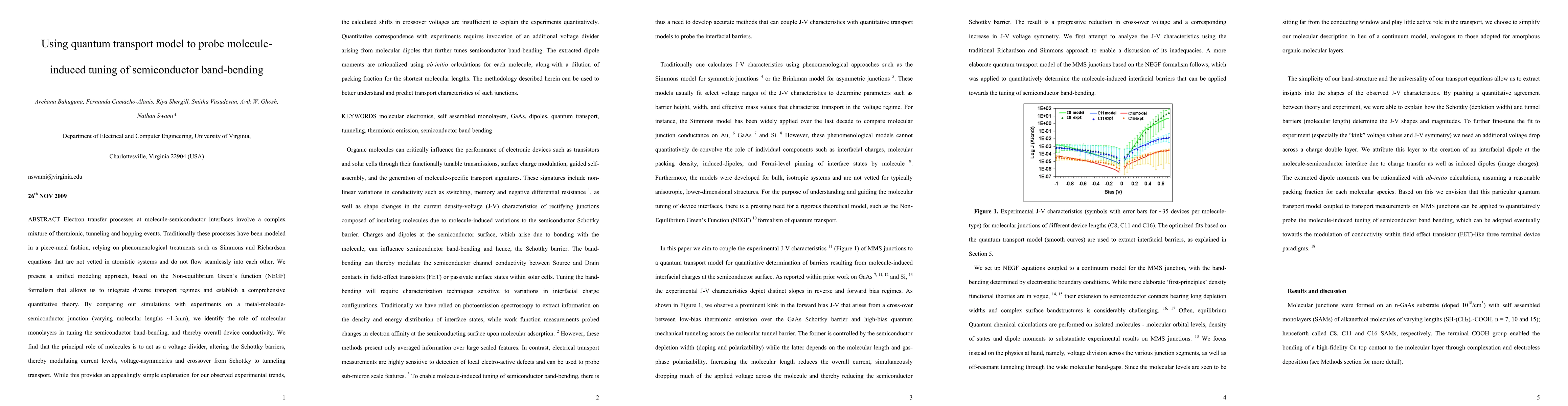 This paper presents a unified modeling approach using Non-equilibrium Greens function formalism to study electron transfer at molecule-semiconductor interfaces, revealing that molecules act as voltage dividers modulating the Schottky barrier and current levels. The study also finds that molecular dipoles further influence band-bending, necessitating their consideration for quantitative agreement with experimental observations.