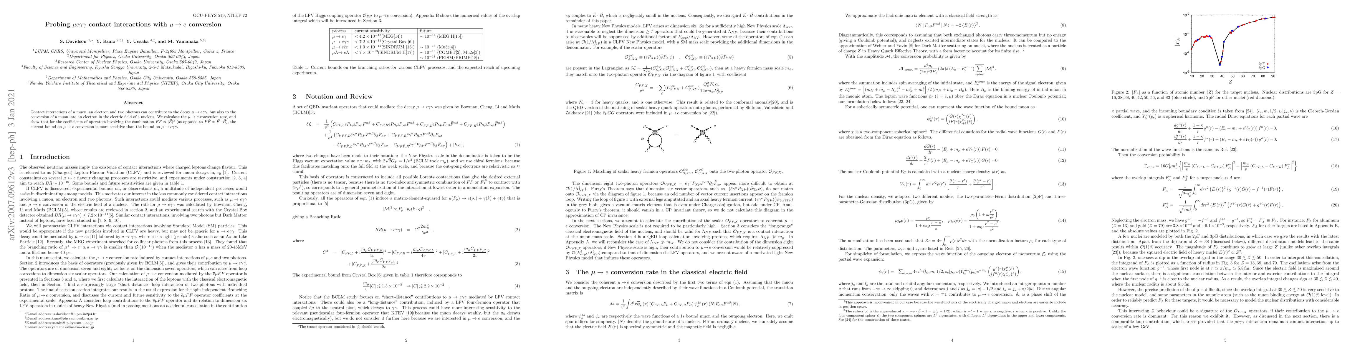 Contact interactions of a muon, an electron and two photons can contribute to the decay $\mu \to e \gamma \gamma$, but also to the conversion of a muon into an electron in the electric field of a nucleus. We calculate the $\mu \to e$ conversion rate, and show that for the coefficients of operators involving the combination $FF \propto |\vec{E}|^2$ (as opposed to $F\tilde{F} \propto \vec{E} \cdot \vec{B}$), the current bound on $\mu \to e$ conversion is more sensitive than the bound on $\mu \to e \gamma \gamma$.
