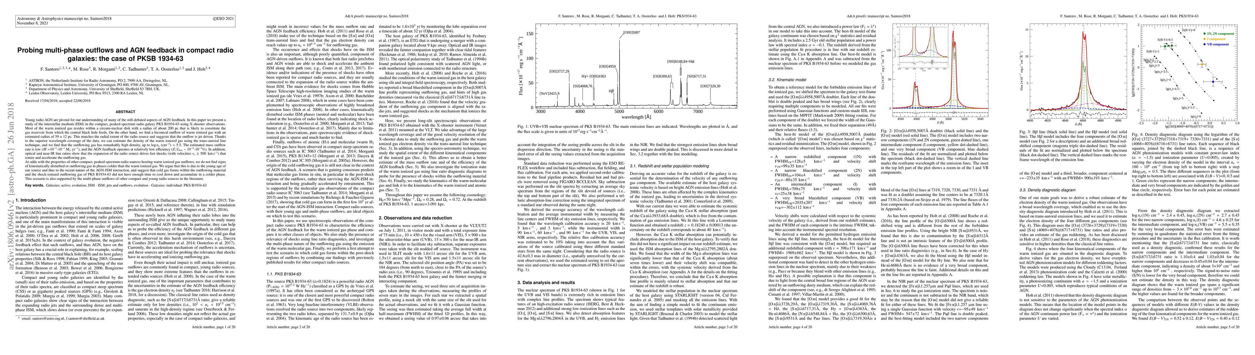 Young radio AGN are pivotal for our understanding of many of the still-debated aspects of AGN feedback. In this paper we present a study of the interstellar medium in the compact, peaked-spectrum radio galaxy PKSB1934-63 using X-shooter observations. Most of the warm ionized gas resides within a circum-nuclear disk with a radius of about 200pc that is likely to constitute the gas reservoir from which the central black hole feeds. On the other hand, we find a biconical outflow of warm ionized gas with an estimated radius of 59+/-12pc. This matches the radial extent of the radio source and suggests that the outflow is jet driven. Thanks to the superior wavelength coverage of the data, we can estimate the density of the warm ionized gas using the trans-auroral line technique, and we find that the outflowing gas has remarkably high density, up to n_e~10^5.5cm^-3 . The estimated mass outflow rate is low (M_dot=10^-3 - 10^-1 M_solar/yr) and the AGN feedback operates at relatively low efficiency (E_dot/L_bol~10^-4 - 10^-3 %), in contrast to predictions of theoretical models. In addition, optical and near-IR line ratios show that the expansion of the radio source drives fast shocks (with velocities v>500km/s) that ionize and accelerate the outflowing gas. At odds with the properties of other compact, peaked-spectrum radio sources hosting warm ionized gas outflows, we do not find signs of kinematically disturbed or outflowing gas in phases colder than the warm ionized gas. We argue that this is due to the young age of our source and thus to the recent nature of the AGN-ISM interaction, and suggest that cold gas forms within the outflowing material and the shock-ionized outflowing gas of PKSB1934-63 did not have enough time to cool down, and accumulate in a colder phase. This scenario is also supported by the multi-phase outflows of other compact and young radio sources in the literature.