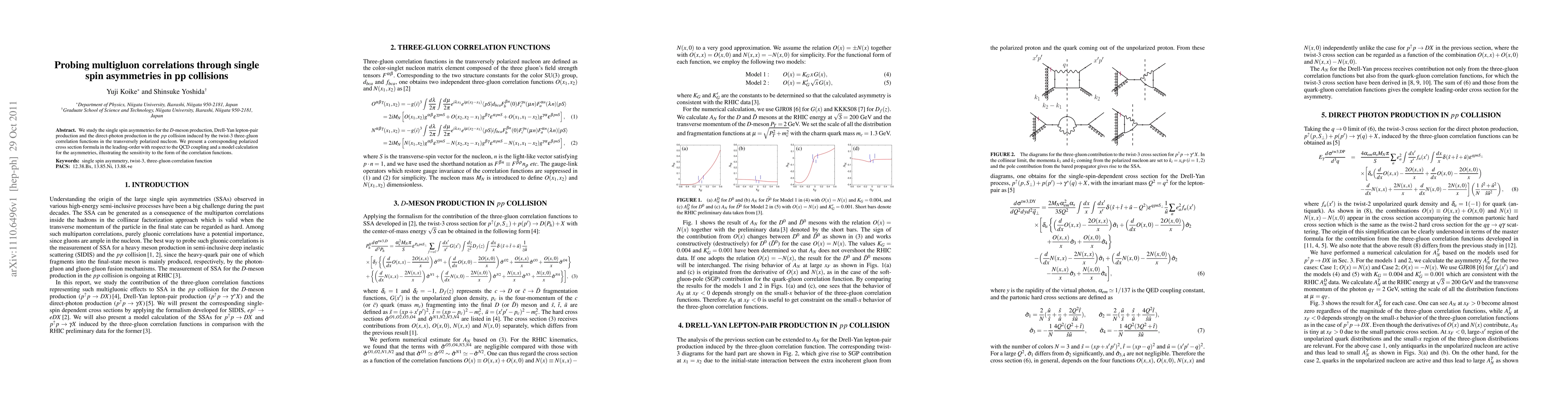 This study investigates single spin asymmetries in pp collisions through multigluon correlations, providing a polarized cross section formula and model calculations for D-meson production, lepton-pair production, and direct-photon production.
