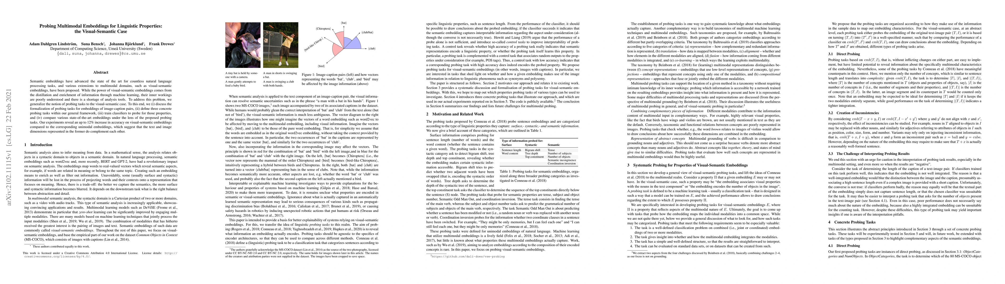 This paper proposes a method to probe multimodal visual-semantic embeddings through formalizing probing tasks for image-caption pairs, defining three specific tasks, and training classifiers to identify linguistic properties. The results show a 12% improvement in accuracy compared to unimodal embeddings, indicating that visual-semantic embeddings better capture the complementary information from text and images.