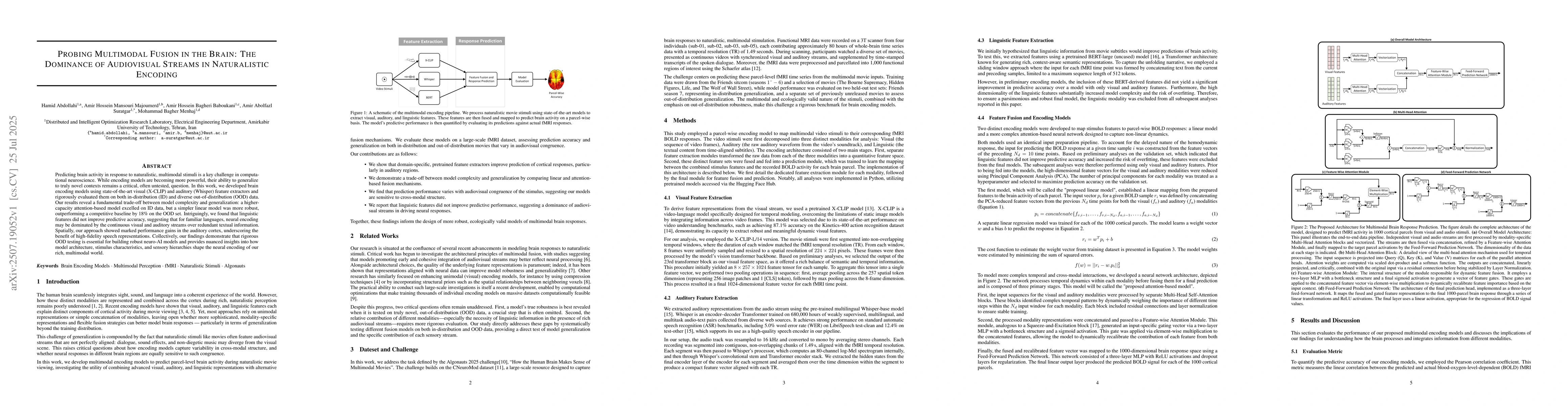 The study developed brain encoding models using state-of-the-art visual (X-CLIP) and auditory (Whisper) feature extractors, rigorously evaluating them on both in-distribution (ID) and diverse out-of-distribution (OOD) data. Two distinct models were created: a linear model and a more complex attention-based neural network to capture non-linear dynamics. Both models used an identical input preparation pipeline, reducing high-dimensional feature vectors using Principal Component Analysis (PCA) before feeding them into the models.