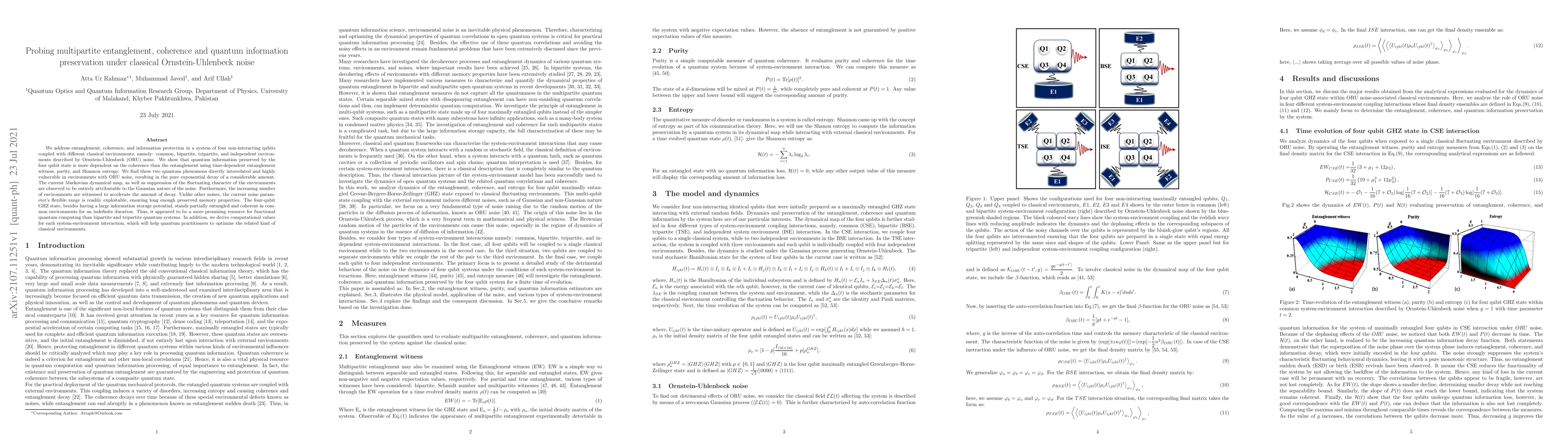 This paper investigates the effects of classical Ornstein-Uhlenbeck noise on multipartite entanglement, coherence, and quantum information preservation in a four-qubit system. It finds that quantum information preservation is more dependent on coherence than entanglement, with both phenomena decaying exponentially under ORU noise.
