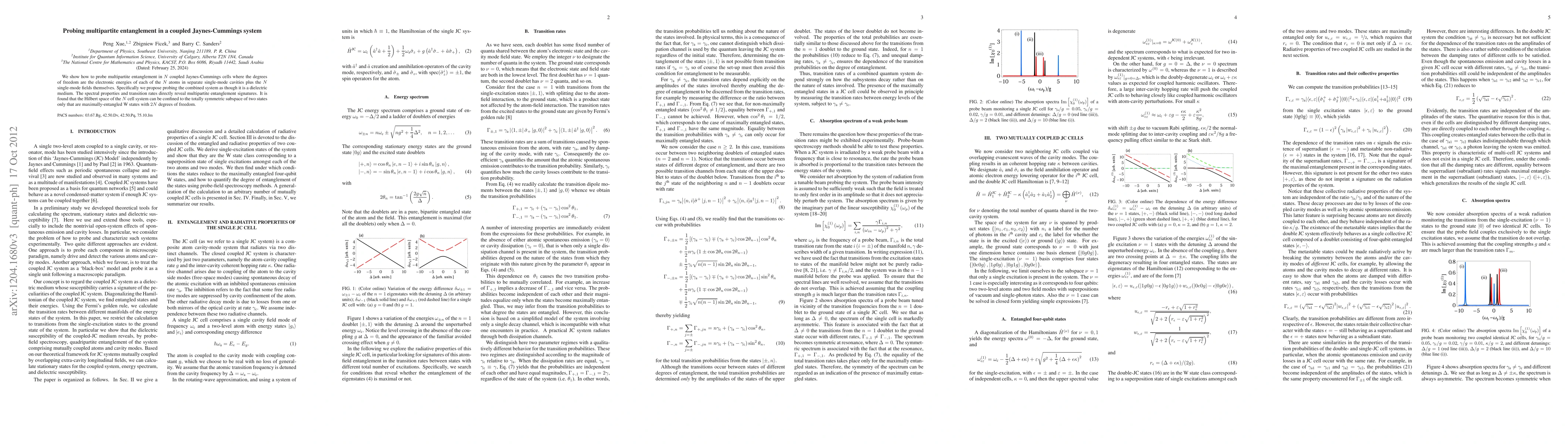 The paper presents a detailed theoretical framework for probing multipartite entanglement in coupled Jaynes-Cummings systems, identifying entangled states and their radiative properties.