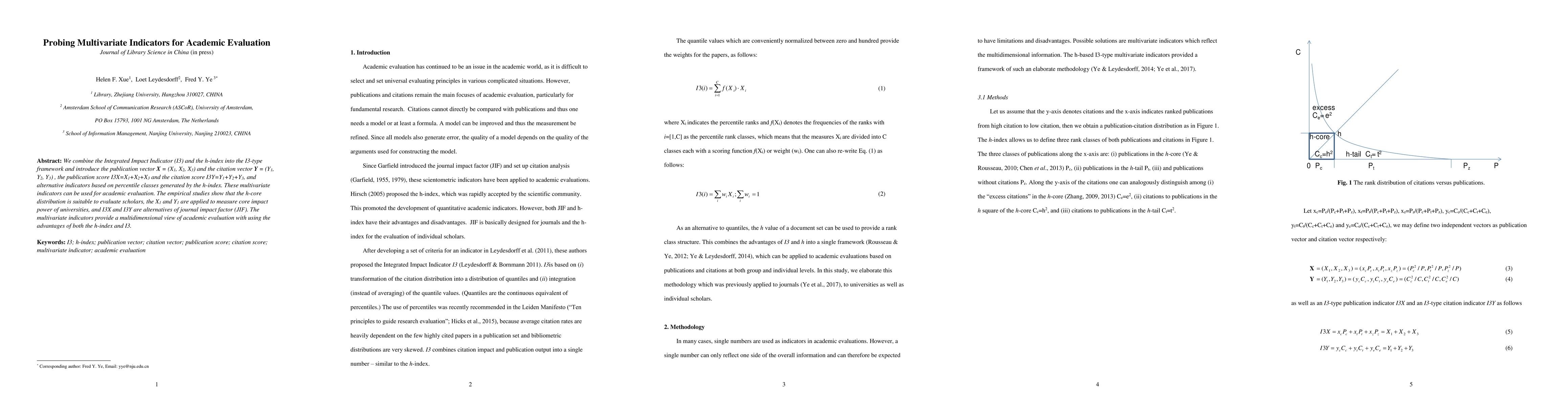 We combine the Integrated Impact Indicator (I3) and the h-index into the I3-type framework and introduce the publication vector X = (X1, X2, X3) and the citation vector Y = (Y1, Y2, Y3) , the publication score I3X=X1+X2+X3 and the citation score I3Y=Y1+Y2+Y3, and alternative indicators based on percentile classes generated by the h-index. These multivariate indicators can be used for academic evaluation. The empirical studies show that the h-core distribution is suitable to evaluate scholars, the X1 and Y1 are applied to measure core impact power of universities, and I3X and I3Y are alternatives of journal impact factor (JIF). The multivariate indicators provide a multidimensional view of academic evaluation with using the advantages of both the h-index and I3.