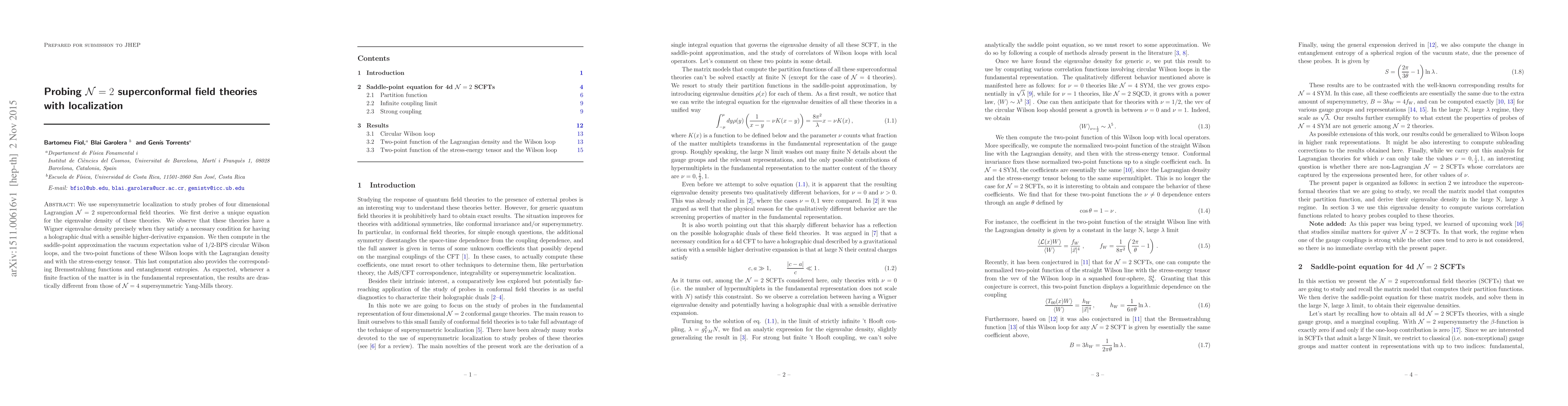 We use supersymmetric localization to study probes of four dimensional Lagrangian N=2 superconformal field theories. We first derive a unique equation for the eigenvalue density of these theories. We observe that these theories have a Wigner eigenvalue density precisely when they satisfy a necessary condition for having a holographic dual with a sensible higher-derivative expansion. We then compute in the saddle-point approximation the vacuum expectation value of 1/2-BPS circular Wilson loops, and the two-point functions of these Wilson loops with the Lagrangian density and with the stress-energy tensor. This last computation also provides the corresponding Bremsstrahlung functions and entanglement entropies. As expected, whenever a finite fraction of the matter is in the fundamental representation, the results are drastically different from those of N=4 supersymmetric Yang-Mills theory.