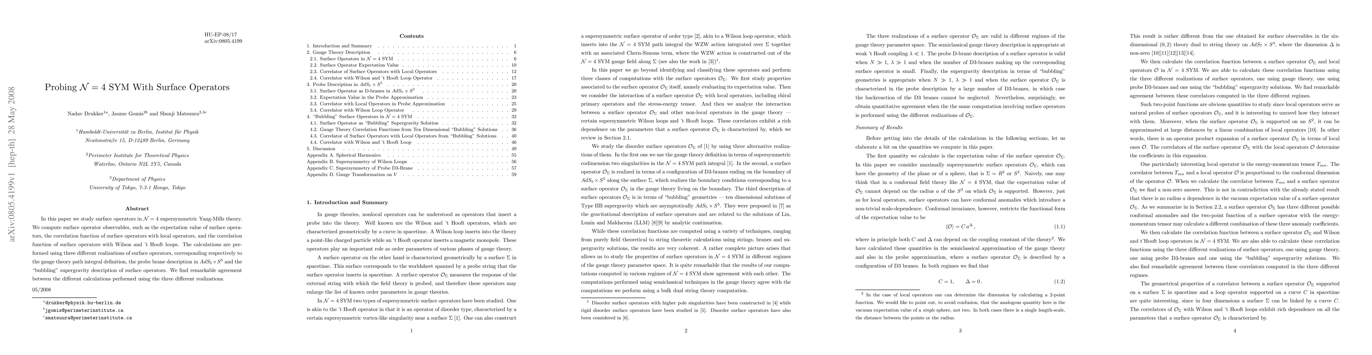 In this paper we study surface operators in N=4 supersymmetric Yang-Mills theory. We compute surface operator observables, such as the expectation value of surface operators, the correlation function of surface operators with local operators, and the correlation function of surface operators with Wilson and 't Hooft loops. The calculations are performed using three different realizations of surface operators, corresponding respectively to the gauge theory path integral definition, the probe brane description in AdS_5xS^5 and the "bubbling'' supergravity description of surface operators. We find remarkable agreement between the different calculations performed using the three different realizations.