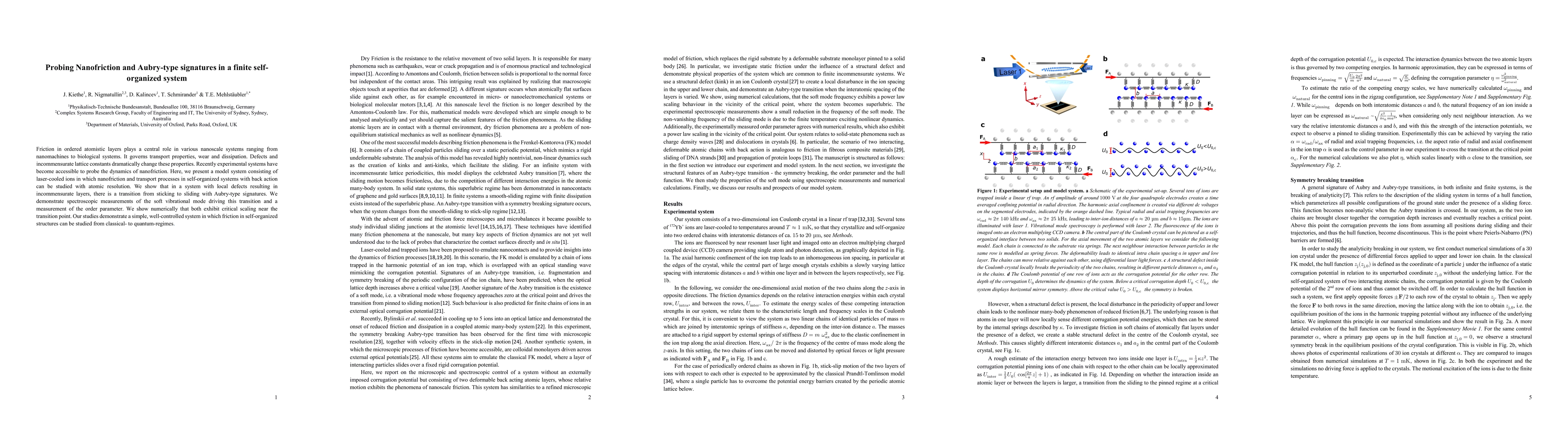 Friction in ordered atomistic layers plays a central role in various nanoscale systems ranging from nanomachines to biological systems. It governs transport properties, wear and dissipation. Defects and incommensurate lattice constants dramatically change these properties. Recently experimental systems have become accessible to probe the dynamics of nanofriction. Here, we present a model system consisting of laser-cooled ions in which nanofriction and transport processes in self-organized systems with back action can be studied with atomic resolution. We show that in a system with local defects resulting in incommensurate layers, there is a transition from sticking to sliding with Aubry-type signatures. We demonstrate spectroscopic measurements of the soft vibrational mode driving this transition and a measurement of the order parameter. We show numerically that both exhibit critical scaling near the transition point. Our studies demonstrate a simple, well-controlled system in which friction in self-organized structures can be studied from classical- to quantum-regimes.